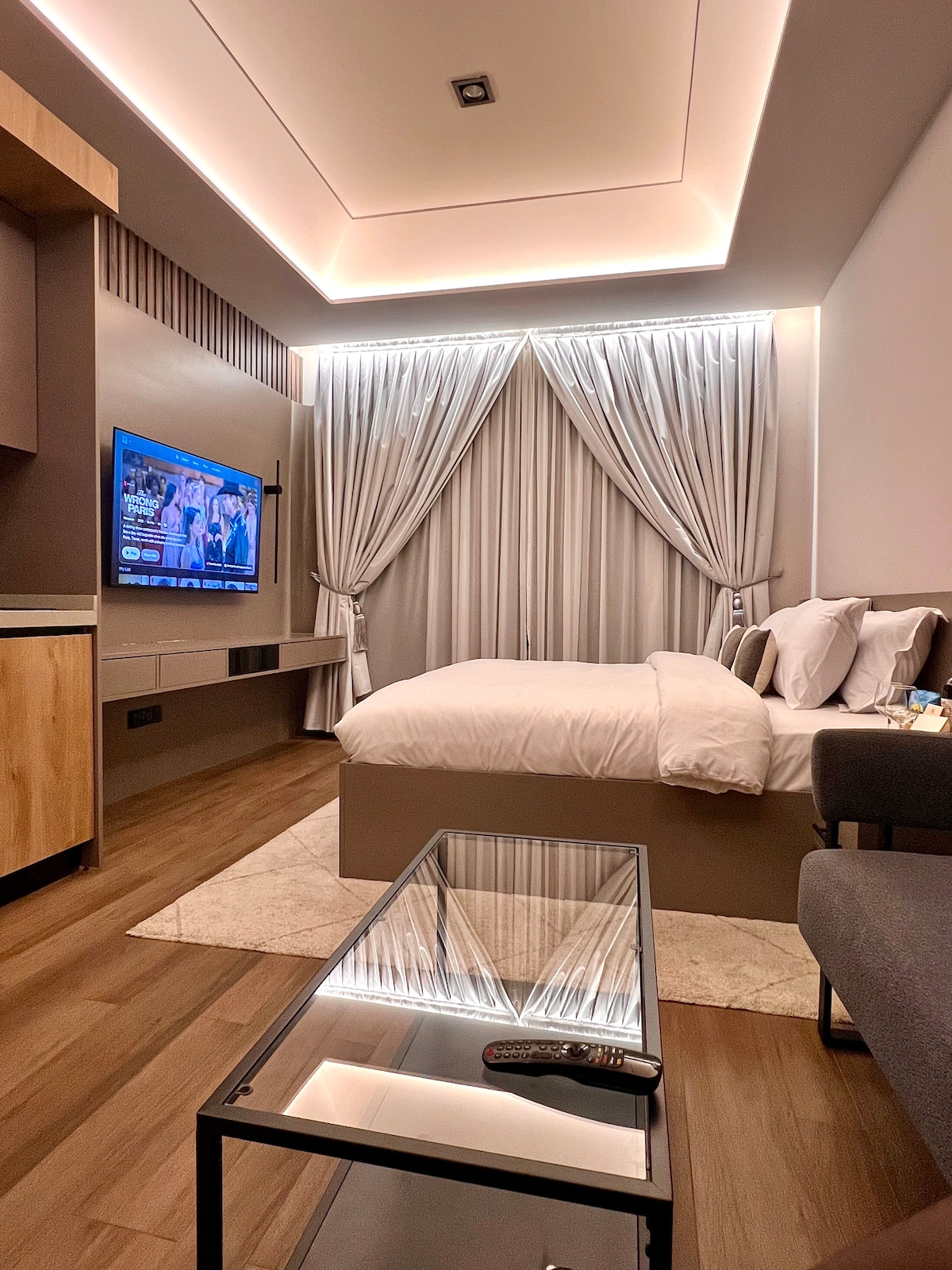 A quiet, elevated stay in the heart of Airport, Accra. This luxury minimalist one-bedroom apartment sits on the 5th floor, where soft natural light and open views of the Accra rail line create a sense of calm movement and space. Designed with intention, the apartment blends clean lines with comfort, offering a place to reset, think, and simply be. Enjoy effortless access to the pool just steps away on the same floor, along with a gym and rooftop for slower moments or evening wind-downs.