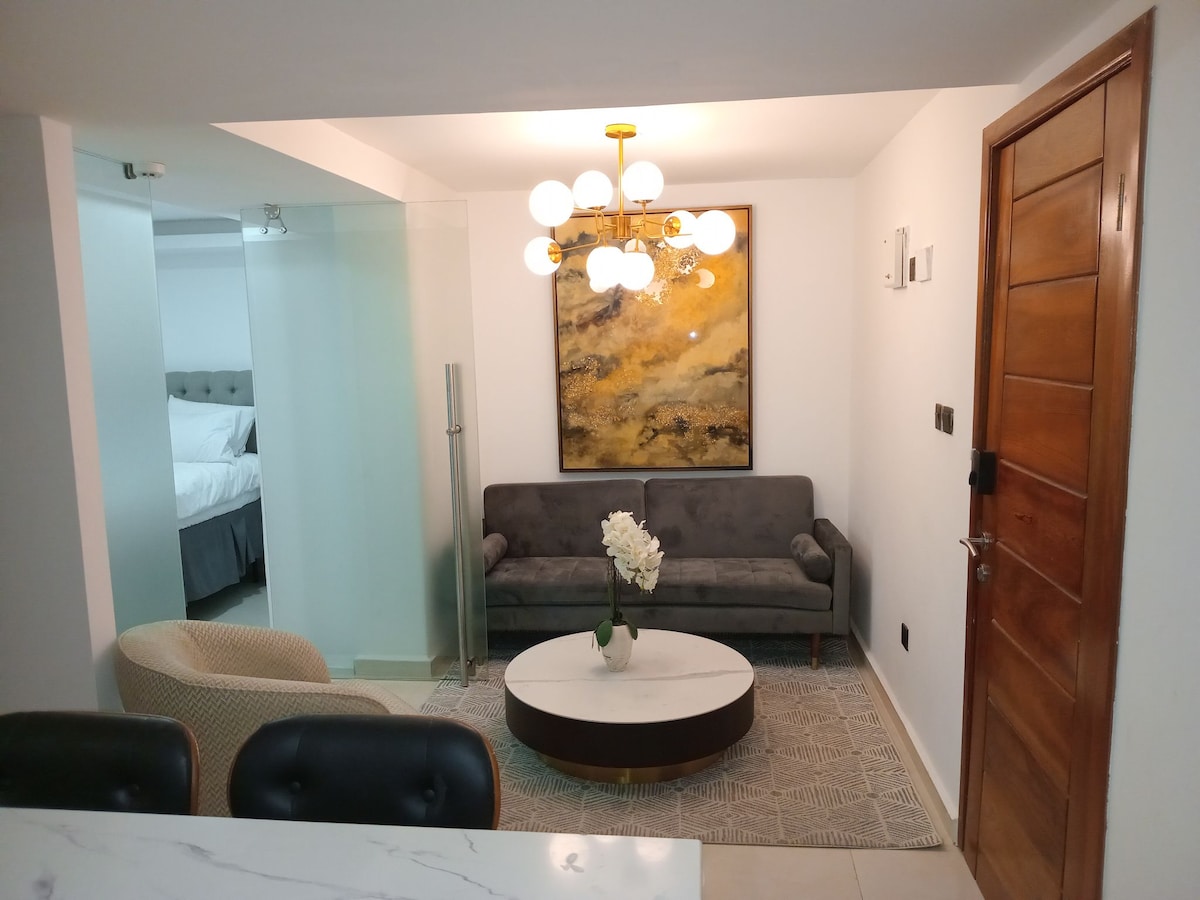 Luxurious studio apartment with a private bathroom, kitchenette with workspace/dining area. The apartment is located in a sought after neighborhood close to the US Embassy in Accra. The apartment has modern amenities, high end fittings, contemporary decor including a chandelier that brightens up the apartment.