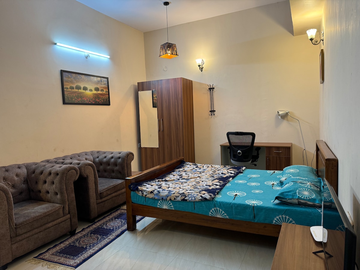 Forget your worries in this spacious, neat, tidy & adorable place situated in a calm neighborhood. The place is cosy and just right for working and relaxing. Located just 5 mins from Manyata Tech Park with easy accessibility to the airport. It has a built-in work station, kitchenette, clean bathroom and ample space to park inside the premises. With 24/7 hot water and Wi-Fi, this place can give you the peace of mind you need for your work or leisure trip.