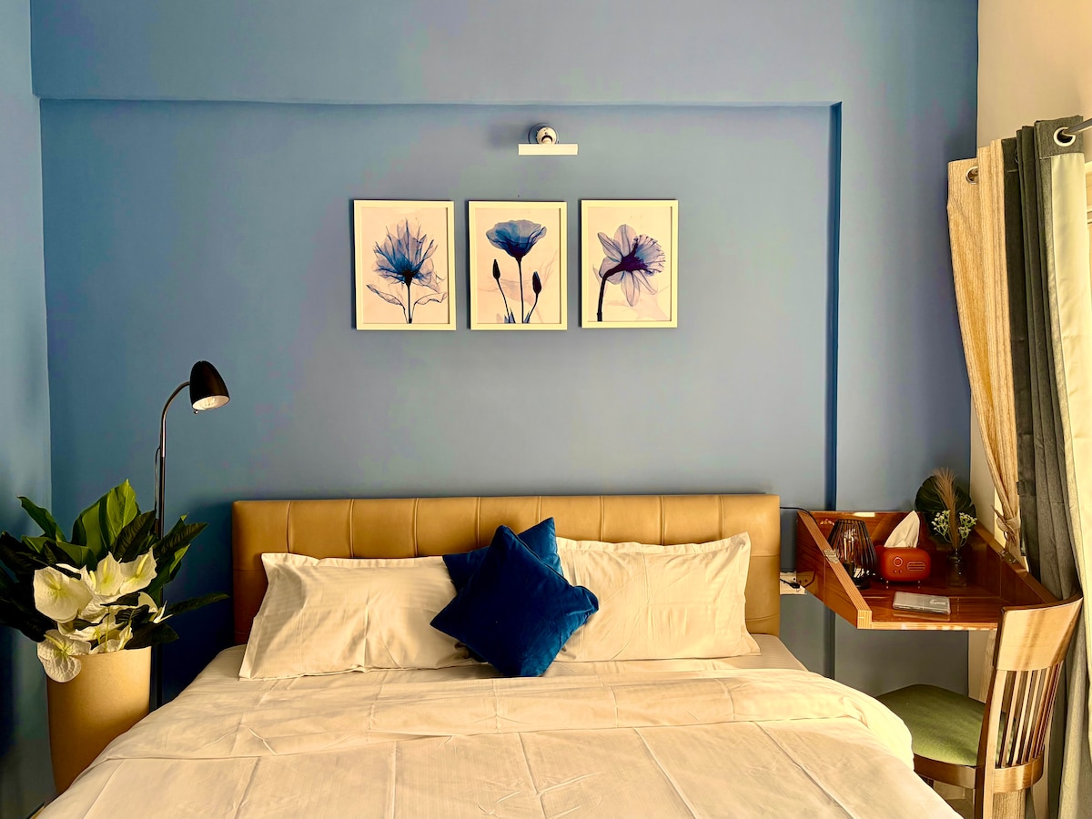 Welcome! A calm and tastefully done penthouse aesthetically setup with a private courtyard, perfect for a quiet, peaceful & relaxing stay for travelers and groups. Spend some tranquil time in your private king-sized bedroom with attached bathrooms and an additional double bed-sofa & powder room. Whip a quick meal in the self-contained kitchen or mix a drink at the bar unit. Spend time gazing at the terrace patio. Meditate, read a book in the courtyard, and enjoy a movie night in the living room.