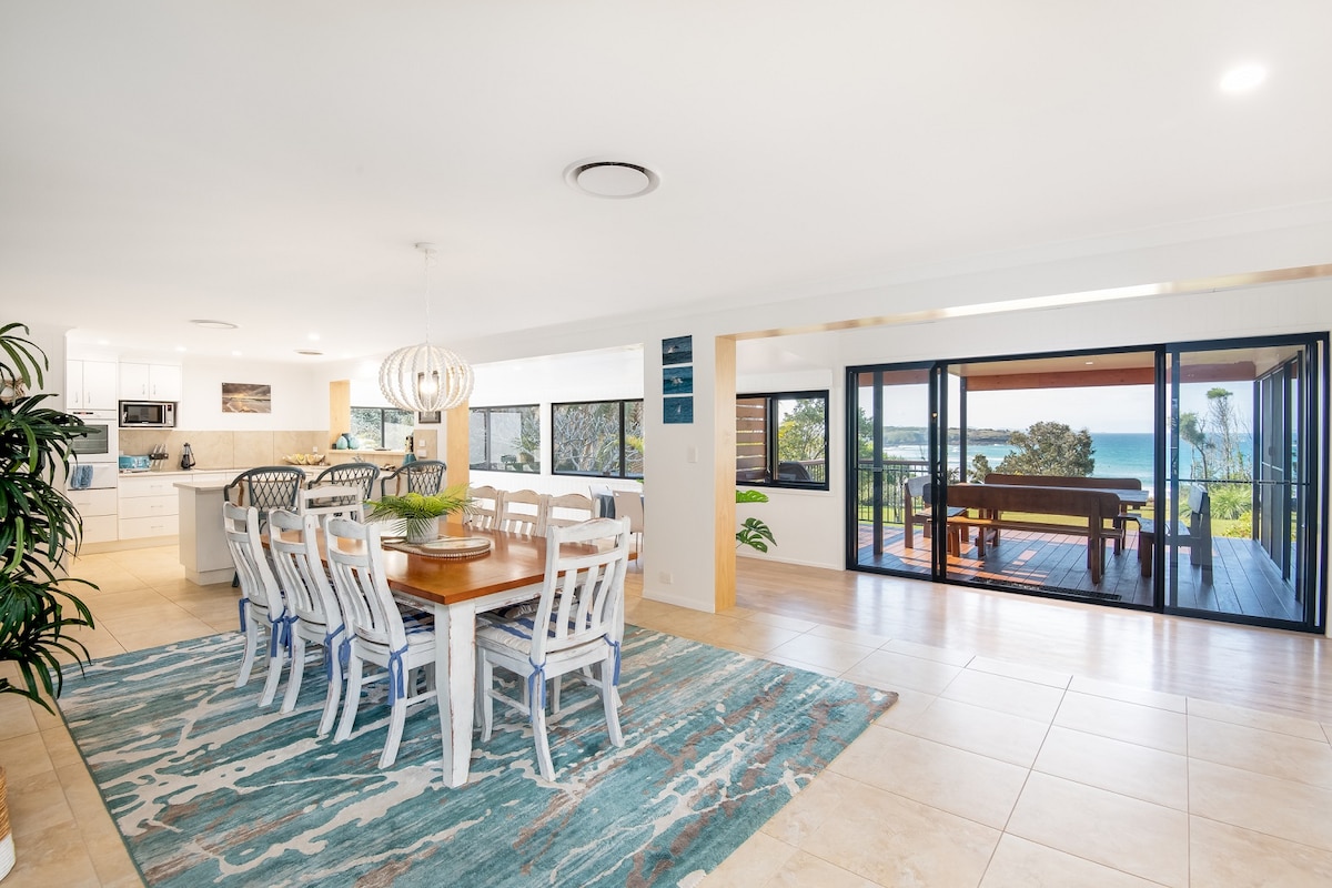 ULTIMATE BEACH HOUSE - JAW DROPPING OCEAN AND ISLAND VIEW. Located in the premier Emerald Beach address, only a casual 200- meter stroll to beach and headland walks with local kangaroos, village cafes, restaurants and shops. Enjoy the beautiful mid north coast weather all year round with the massive indoor-outdoor lounge dining space, floor to ceiling sandstone fireplace (wood supplied), cavity sliding doors opening seamlessly onto the north facing covered entertainer’s deck.