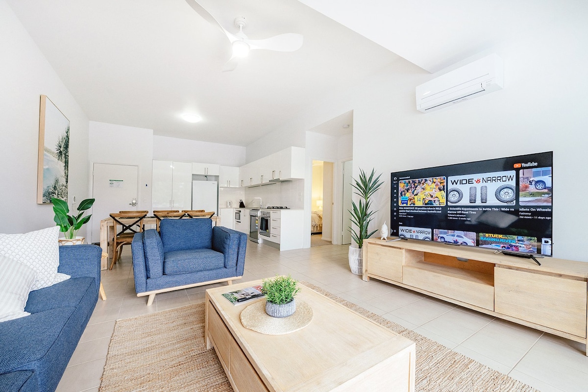 Stay with us Seaside Market St @ the beautiful village of Woolgoolga. Park your car in the complimentary car space as you are in the heart of the village. Morning coffees/breakfast, swims and long walks along the beach, fish and chips on the village green, sunset drinks & dinner are all at your fingertips. With 2 bed & 2 Bathrooms Stay Seaside Market St is the perfect space for two couples or a small family.