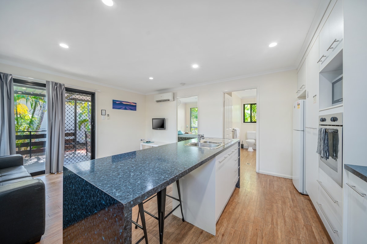 Our Luxury Queen Apartments features 1 Queen Bed in a separate bedroom and sleeps up to 2. These are stylish, private stand-alone Apartments not in a building complex perfect for peaceful and luxurious accommodation. This apartment features: Queen bed in separate bedroom, large lounge area, Spa ensuite and full laundry facilities, full kitchen facilities (See attached photos), a private patio area in a tropical garden setting, and a private undercover car park.