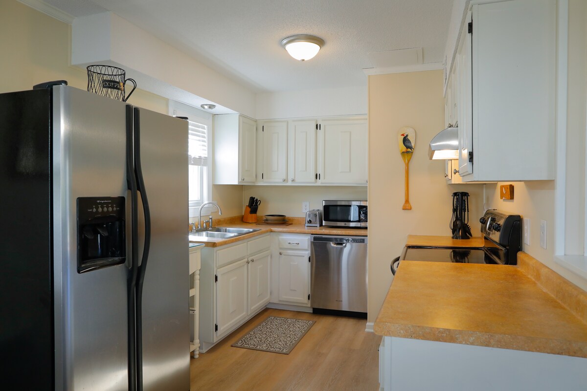 EARLY BIRD DISCOUNTS -BOOK NOW! Live like the locals in this bright, beautiful, clean 1 bedroom suite in “downtown” EI! 10 min walk to beach, 3 min walk to "little pier" on the sound. FREE gated beach parking lot just east of Bogue Pier. 2 kayaks, 2 bikes/beach chairs. Luxury shower, gorgeous full kitchen. Outdoor shower, patio, charcoal grill. Linens provided. Off street pkg. Close to everything! You must be 21 or older to book. Anyone 21 or younger must be accompanied by parent/guardian