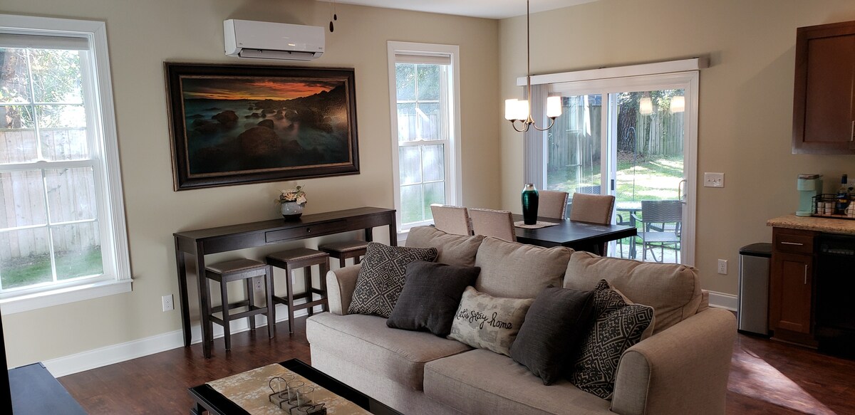 The Tree House apartment is an 700+ sq ft private residence on the first floor of our house. It has a private entrance and parking for up to 2 vehicles, if more than 2 spots are needed please let us know. The apartment has a full size kitchen, dining area, and spacious living room. There is a king bed in the bedroom and shower/tub in the bathroom. This rental is located less than 5 minutes from Carolina Beach and is 15 minutes away from the beautiful and historic downtown, Wilmington.