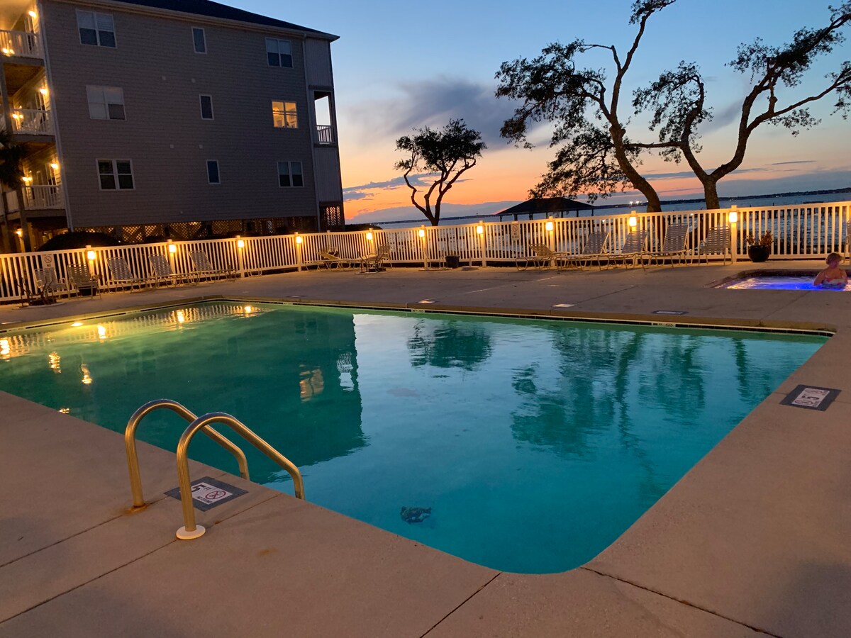 We renovated in Feb 2024– new floors, paint, lighting… come enjoy the beauty! Relax with the whole family at this peaceful ocean-front condominium in the Ocean Club, Indian Beach, Building A. Well-equipped with beach toys, boogie boards and a kayak; clean, comfortable with ocean front views from the back porch. Access to clubhouse, weight room, two pools and two hot tubs and private sound-side pier. Come enjoy the quiet beach!