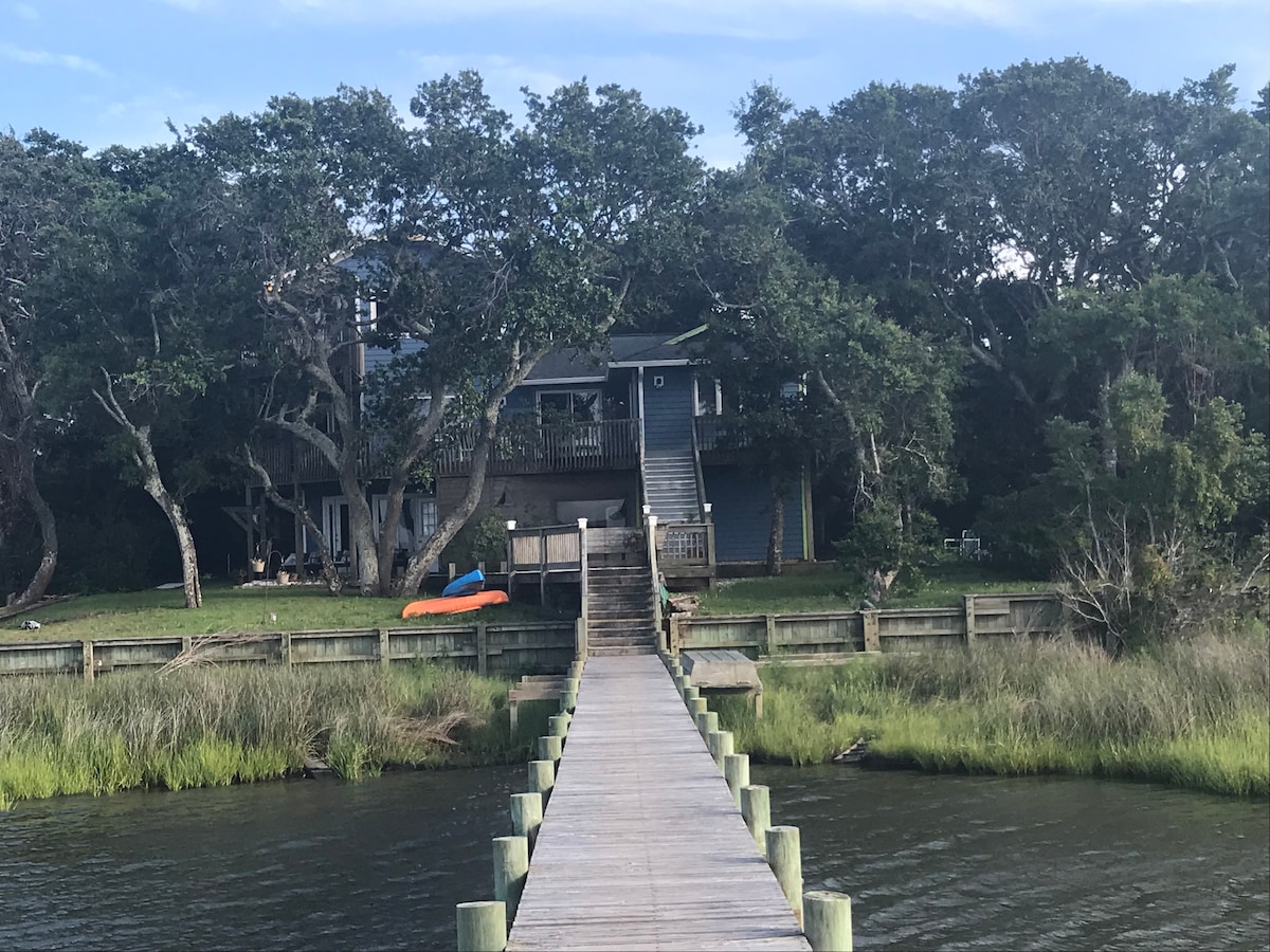 Fishing paradise, reading retreat, and breathtaking sunrise and moonlight from your private hottub on the back deck. Tandem kayak and small boat included. You can fish, kayak, or wade from the back yard! We've caught drum, flounder, shrimp, etc. Master has a king nectar bed and an amazing view of the water from the picture windows. 3 miles to beach, 13 miles to Aquarium, & 13 miles to Camp Lejeune. The road is close but once you exit your vehicle, you feel like you are in your own lil paradise.