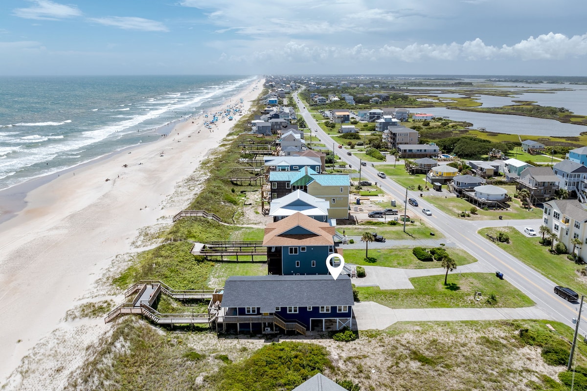 3bd, 2.5 bath. AMAZING views of intercoastal. Community pool (open NOW) & the ocean is across the street! Level 2 EV charger included. Golden Tee arcade, 3-in-1 foosball, hockey, billiards upstairs. Large connect-4 in the carport.. Dock where you can fish, kayak (included), paddle board (included). 9ft foam surf board to ride waves. Open plan upstairs w/ updated kitchen that has granite and all the necessities. King, Queen, and bunks w/ 4 flat screen TVs.