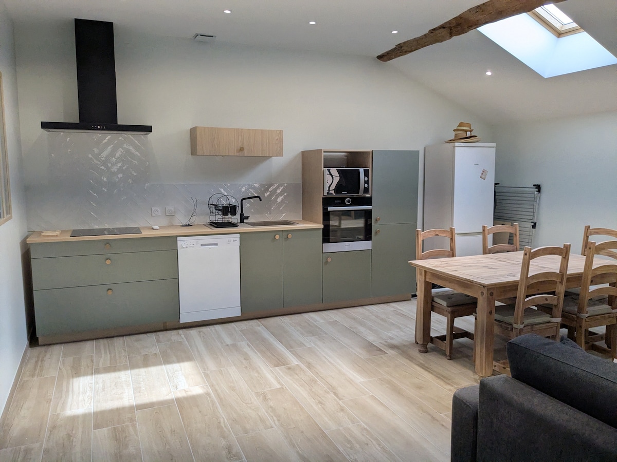 Appartement de 40 m2 rénové à Chénas, pour 2 à 4 personnes tout confort moderne et paisible. Chambre avec lit en 160 + TV Salle de bain + WC Salon canapé convertible 140 Cuisine tout équipée Climatisation réversible A 5 km de la gare de Romaneche Thorins et 12 km de la Gare TGV Mâcon Logement indépendant de plain pied, au RDC de la maison des propriétaires Deux chiens apportent une touche de sécurité et de convivialité. Non fumeur, pas d'animaux autorisés, pas de fête, calme et propre