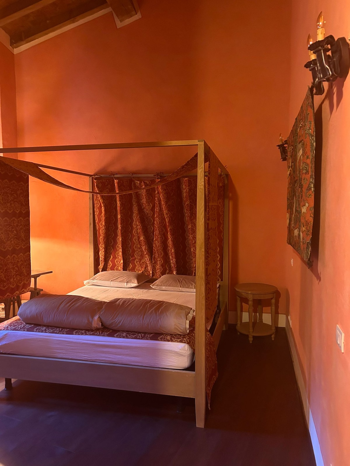 Soggiorno romantico nella nostra stanza AMOR CORTESE, letto a baldacchino e arazzi con vista torre del castello, un soggiorno all'insegna dell'Amore. Un maniero millenario immerso nella natura nel cuore dell'Appennino modenese, il Castello di Montecuccolo vi garantisce un soggiorno all'insegna del relax e della storia. La locanda, con annessa osteria, è arredata con gusto in stile medioevale e le sue stanze vi faranno viaggiare indietro nel tempo senza rinunciare al comfort e alla comodità.