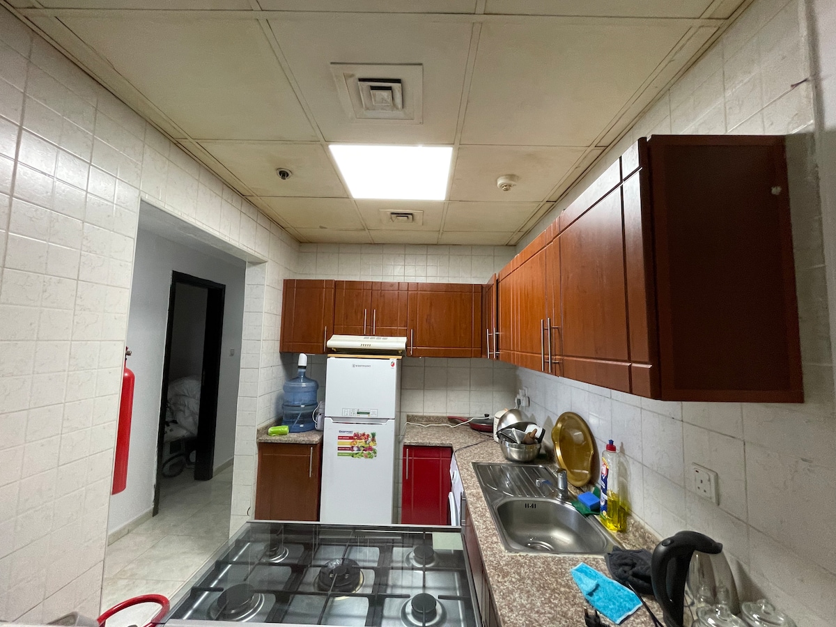 Close to everything just type in ALAMEERA Ajman and you will see that the location has easy access to anything . Recently decorated , nice and clean 1 st floor free parking very clean . Kitchen AC toilet Sofa huge bed etc