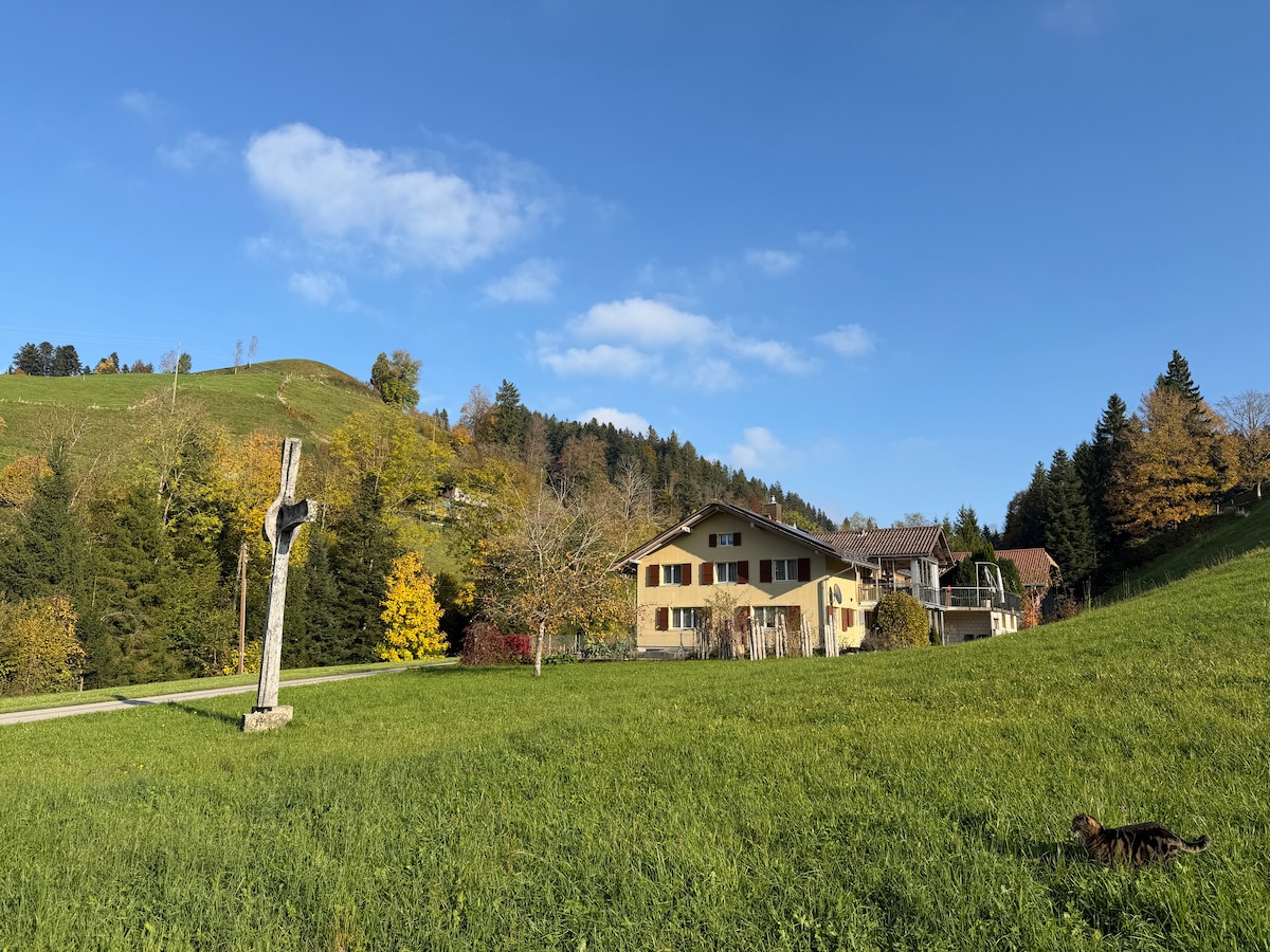 Wir leben an einem wunderschönen Ort mit dem Namen Bühlweidli, also Sonnweidchen, in einem alten renovierten Bauernhaus. Absolute Ruhe, kein Nachbarn und Natur pur. Wir versorgen uns hauptsächlich selbst, dies biodynamisch. Strom, Heizung und Warmwasser aus 100% erneuerbare Energie - dies Sommer wie Winter. Wir versuchen mit der Natur zu leben. Gerne laden wir Dich als Gast hier ein um zu entspannen (u.a. Sauna/Badezuber) und falls du willst unsere Lebensart kennenzulernen.