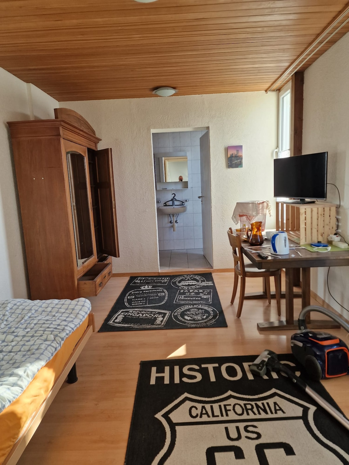 Wow, was für ein gemütlicher Platz vor dem Kaminfeuer. Hier möchte man gerne einziehen und die Ruhe das Landlebens geniessen. Ob alleine, mit Partner oder Familie kannst Du hier einen unvergesslichen Aufenthalt buchen. Im Einklang mit der Natur nach einem Spaziergang im Wald gemütlich am Feuer sitzen und die Gedanken schweifen lassen. Wenn Du gerne Tiere magst, wird dies dein Lieblingsplatz. Das Frühstück ist im Preis enthalten.