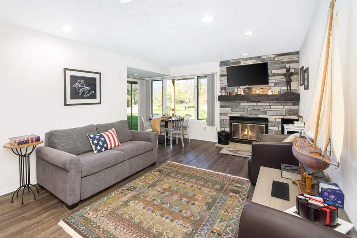 Family friendly condo close to beach, wineries and ski hills. Nestled into the woods with nature trails and a short walk to private beach club on Little Traverse Bay. In between Petoskey and Harbor Springs, both are a 10 minute drive for great food, shopping and fun. Community clubhouse with indoor & outdoor pool, tennis and playground. Condo features 3 bedrooms with 5 beds and pullout couch. Fully stocked Kitchen, 2 fireplaces, and outdoor deck. Note: this property does NOT have A/C.