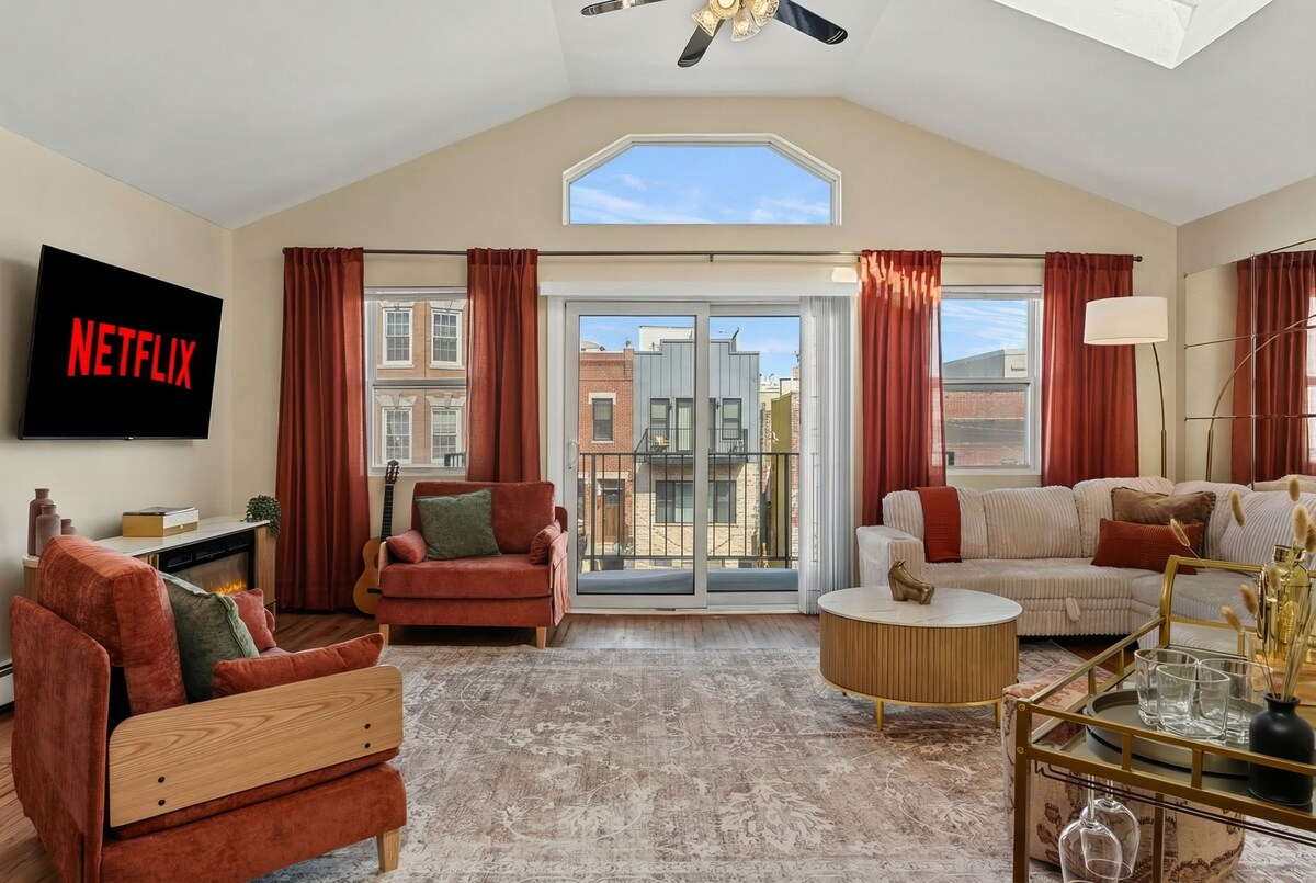 Modern 2BR in vibrant Harrison—14-min walk to PATH for easy NYC access! Soaring ceilings and natural light enhance the space. Relax with plush comforters, soft sheets, and Smart TVs in every room. Perfect for families, remote workers, or groups! Walk to Red Bull Arena, train,bars & eats, or visit American Dream in 14 min. ✔️ 1 Free Parking Spot ✔️ 5 Beds: 1 King, 2 Queen, 2 Twin ✔️ Full Kitchen ✔️ Central AC ✔️ Fast Wi-Fi + Desk Book now for comfort & style