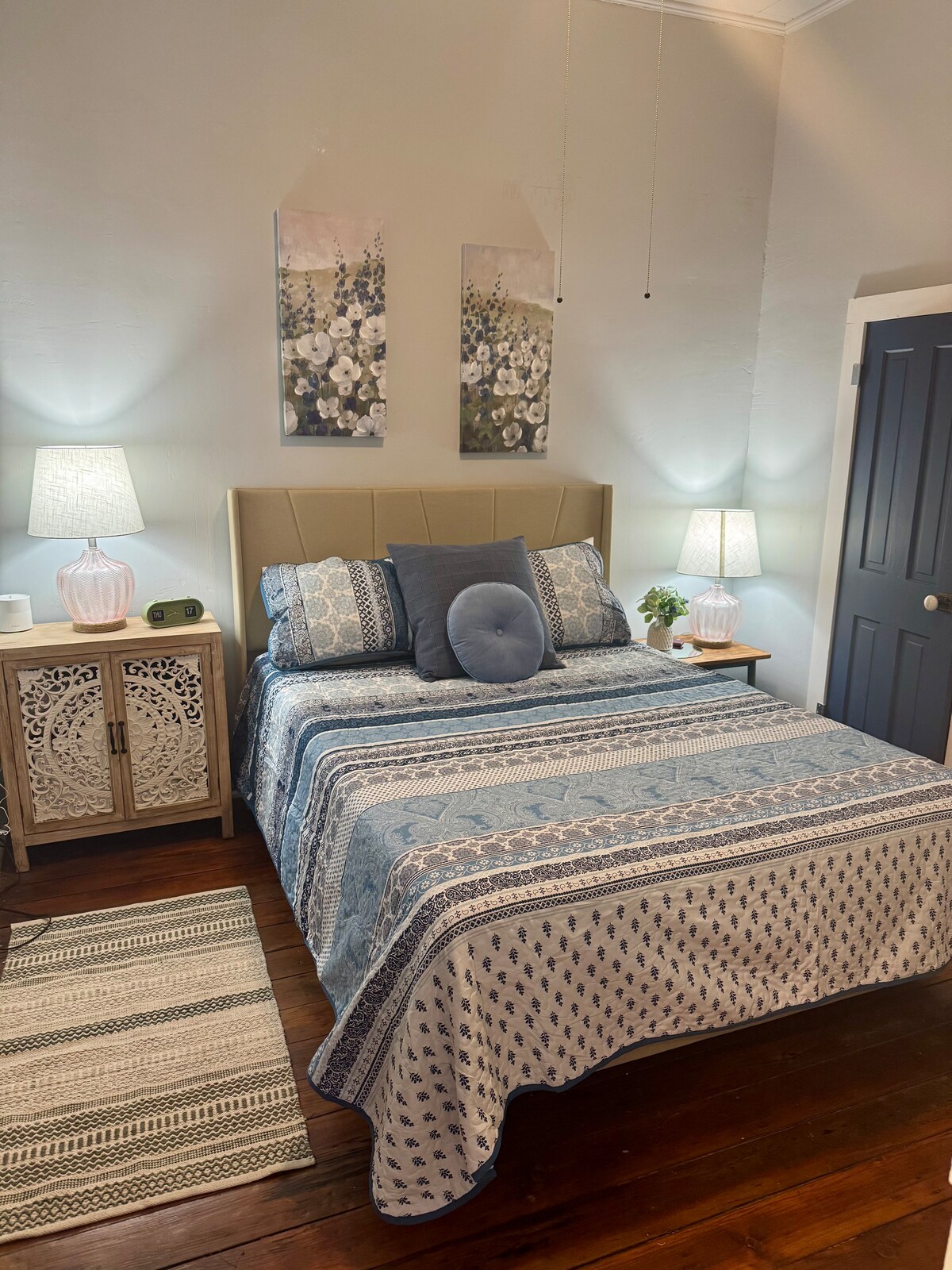 Built in 1863, this romantic second story 1 BR loft features the original hardwood floors and clawfoot tub with shower attachment. Enjoy a couples getaway within walking distance of downtown Council Grove, KS. After a day of exploring, return to grill your own Tiffany Cattle Company steaks on the outdoor terrace! Soak the everyday stress away before falling asleep in the queen-sized wrought iron bed. Enjoy free WiFi & modern-day amenities such as a Smart TV and stay as long as you like!