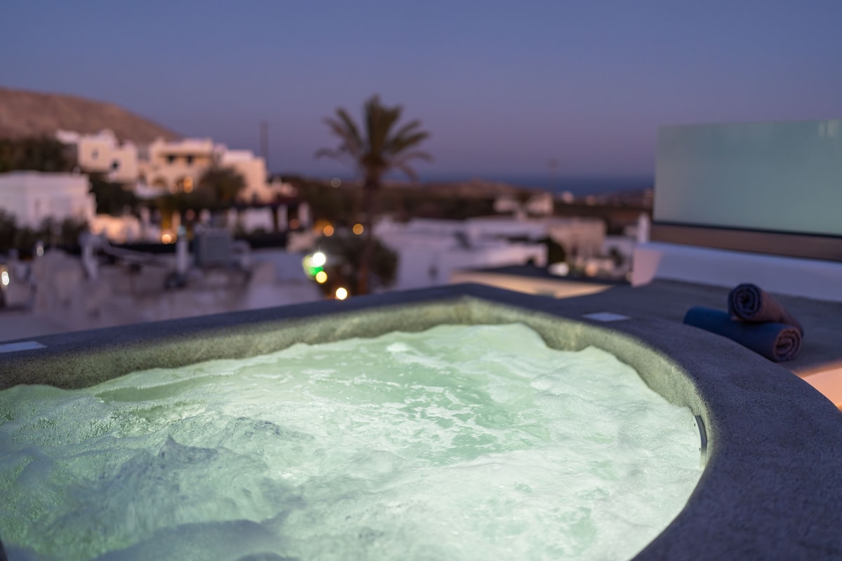 Book your honeymoon in this brand new stunning suite in the heart of Fira, Santorini's capital. George & Joanna Suites presents Teo Suite, its newest addition for all couples who want nothing less than honeymoon! Luxury minimalist, design driven , the suite features a king size bed , partially open concept shower and a balcony with outdoor hot tub. Enjoy the convenience of downtown, in privacy and modern comfort and make your Santorini experience as best as it gets.
