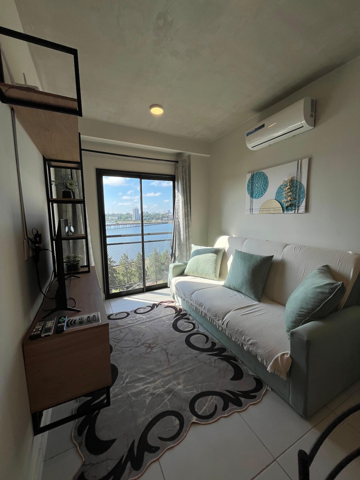 Apartamento con balcón vistas al río y excelente ubicación!📍. A pocos pasos de la Costanera, Playa San José🏖️, restaurantes🍴 y de Shopping Costanera 🛍️. Habitación principal con cama matrimonial 🛏️, sala con sofá cama(2.10 x 0.95 x 0.92) 🛋️, comedor, cocina integrada y baño moderno 🚿 Seguridad 24/7 🔒 y servicio de lavandería dentro del edificio para tu comodidad. Aires Splits en habitación y sala-comedor.