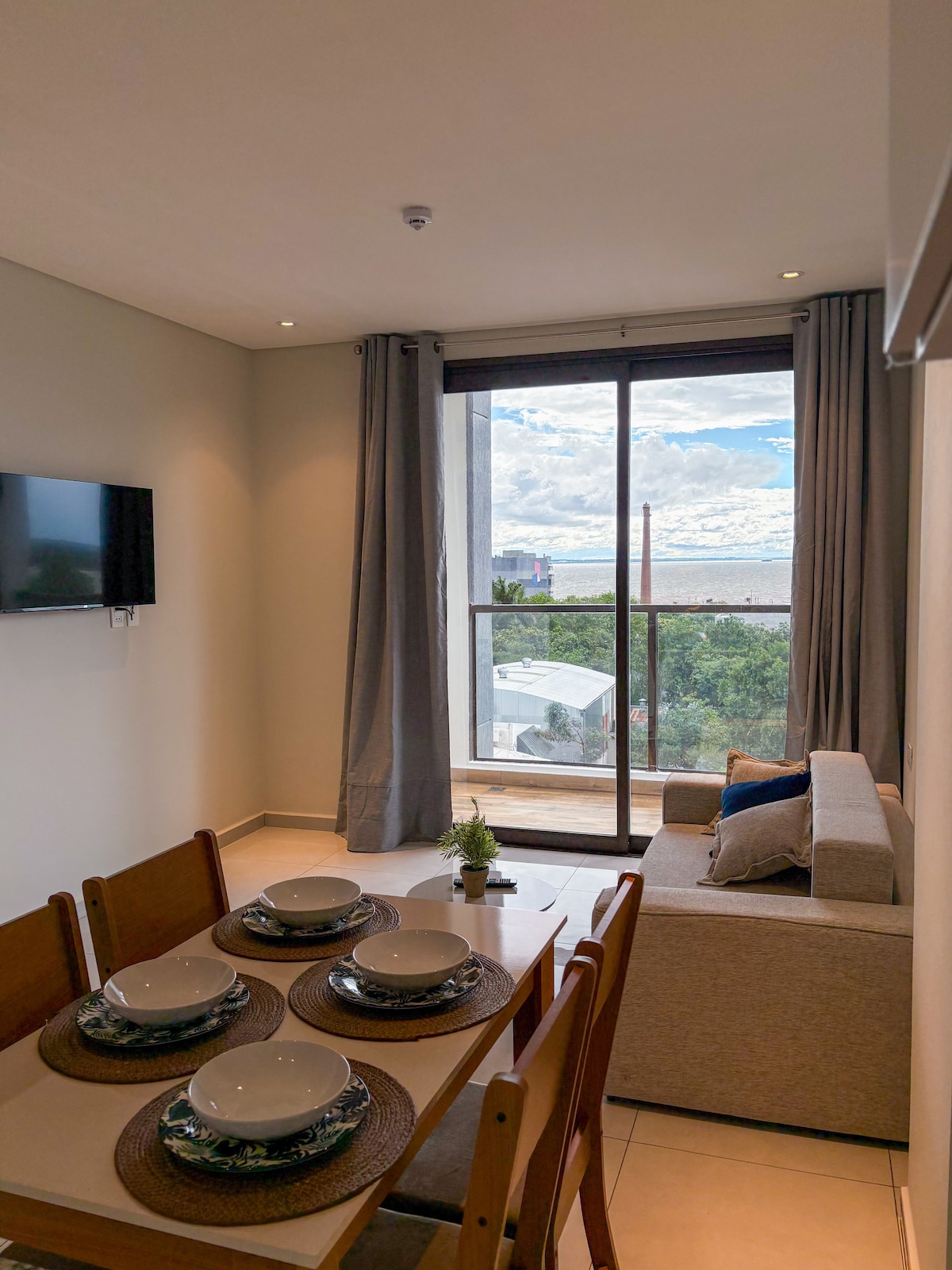 Apartamento con balcón vistas al río y excelente ubicación!📍. A pocos pasos de la Costanera, Playa San José🏖️, restaurantes🍴 y de Shopping Costanera 🛍️. Habitación principal con cama matrimonial 🛏️, sala con sofá cama(2.10 x 0.95 x 0.92) 🛋️, comedor, cocina integrada y baño moderno 🚿 Seguridad 24/7 🔒 y servicio de lavandería dentro del edificio para tu comodidad. Aires Splits en habitación y sala-comedor.