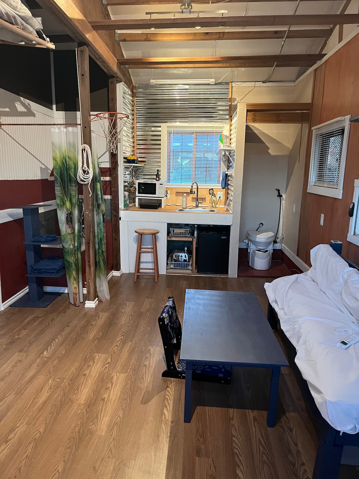 My Tiny Cabin is located on 2.3 forested acres in a rural setting close to Portland and wine country. My home is located on the same property but trees and space between the two provide privacy. A ladder leads you to the upstairs loft with a queen bed and a skylight for a view of the treetops. A futon that folds into a comfortable full sized bed is located downstairs. The kitchenette provides a microwave, small refrigerator and coffee. Step out to the deck to cook on the propane grill.