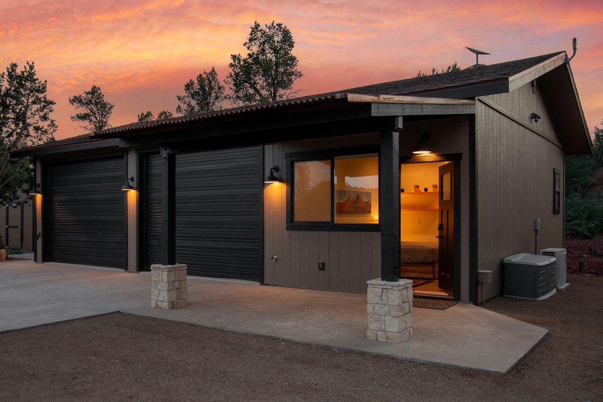 This stylish studio is the perfect place to get away from city life, to experience the peace & quiet of Sedona's high mountain desert. Ideally located at the edge of town on more than 5 acres, you'll have room to roam. Enjoy sunrises & sunsets. Spend time under star-studded skies & take in the full expanse of the Milky Way. Inside you'll find all the creature comforts - luxury hotel bedding, huge flat screen TV, stocked kitchenette (coffee included!), washer/dryer & a large bathroom.