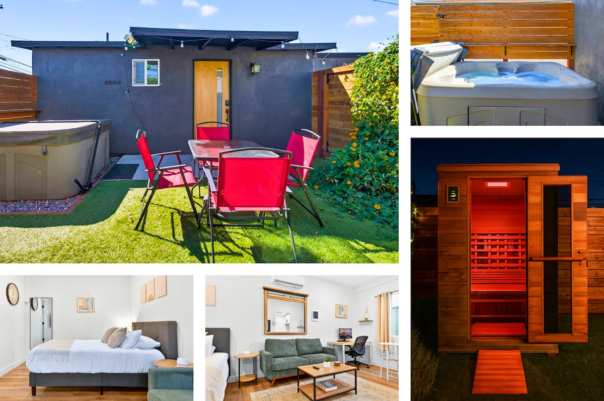 Soothe your senses and unwind in your private spa retreat, featuring a restorative sauna, a huge soaking tub, and the refreshing scent of eucalyptus aromatherapy. Sink into a luxuriously comfortable king bed, surrounded by a calming ambiance. Thoughtful touches like plush robes and a chilled filtered water dispenser elevate your experience. Set in a tranquil neighborhood with easy access to San Diego’s highlights, this sanctuary offers the perfect blend of relaxation, rejuvenation, and comfort.