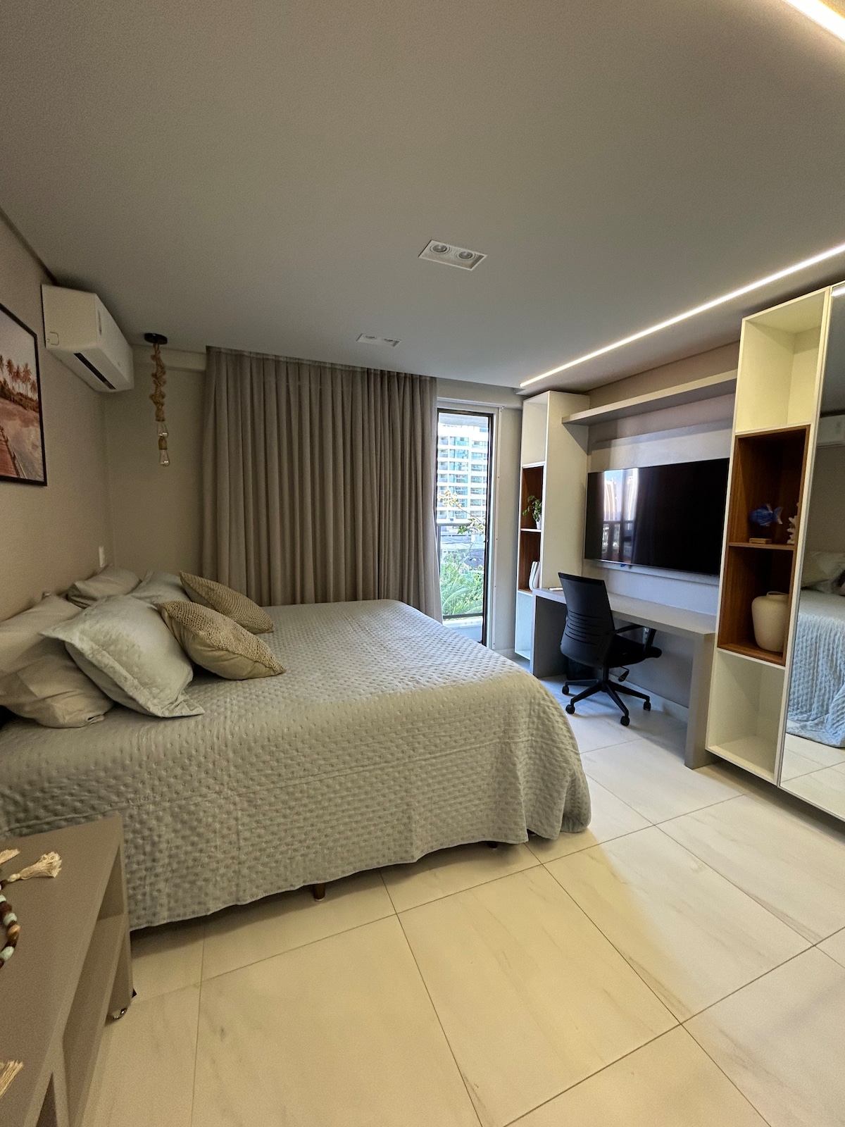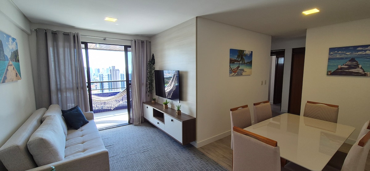 Flat moderno e completo em João Pessoa – localização privilegiada em Manaíra. Pensado para casais e viajantes exigentes, este flat une aconchego, estilo e praticidade em uma das regiões mais valorizadas de João Pessoa. Com design contemporâneo e atmosfera acolhedora, o espaço oferece uma experiência de hospedagem confortável, funcional e bem localizada, ideal para quem busca relaxar ou trabalhar com tranquilidade.