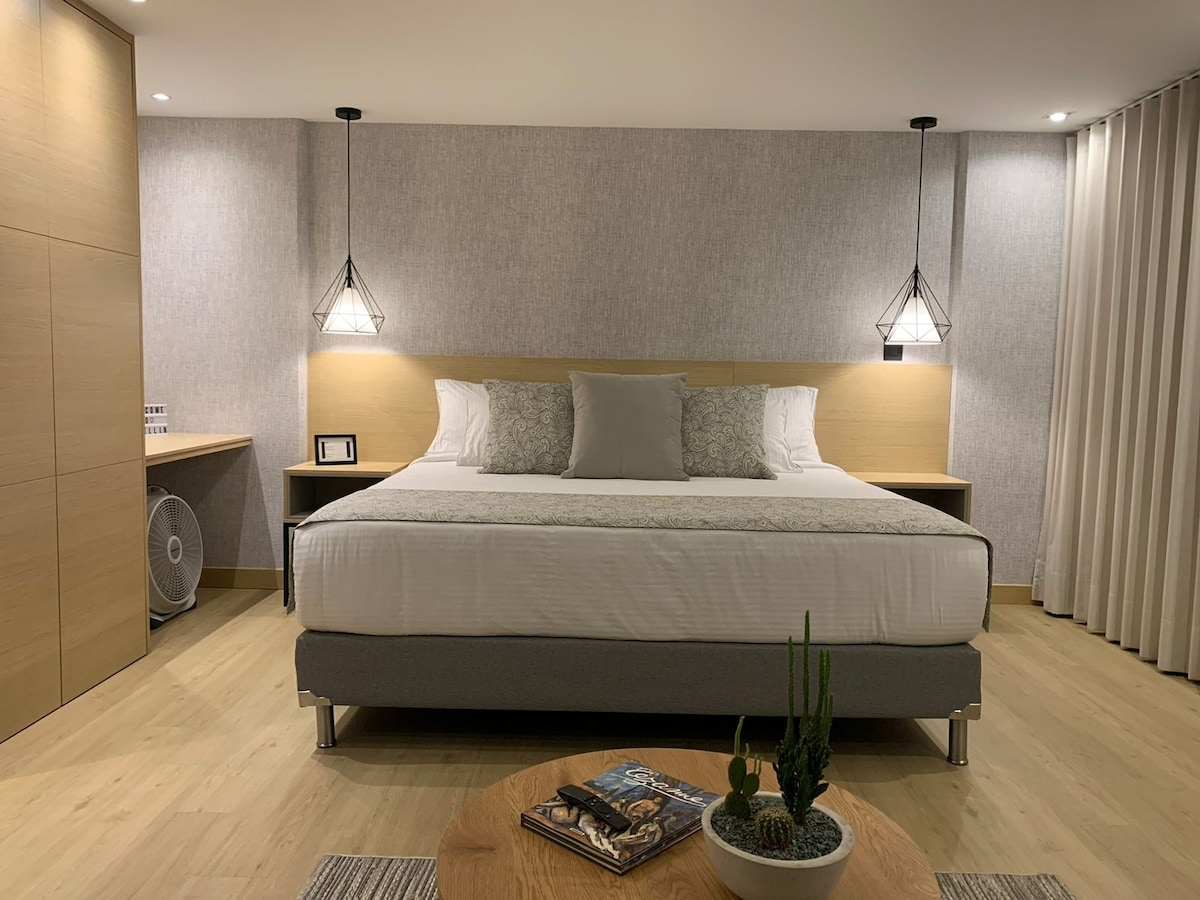 Take it easy at this unique and tranquil getaway. This beautiful, modern new 50 m² studio is ready for you. Workspace, 300 MG wifi speed, A/C, 1,5 bath, will be the perfect getaway for a couple. Near to a park, 200 mts from ATMs, Grocery stores, Restaurants and Cafes. 10 minutes walking to the night party in Provenza and Park Lleras. King bed, amazing view from 8th floor, gym in the building and parking load, security 24/7. *Zero tolerance against sexual tourism. *Please see our house rules.