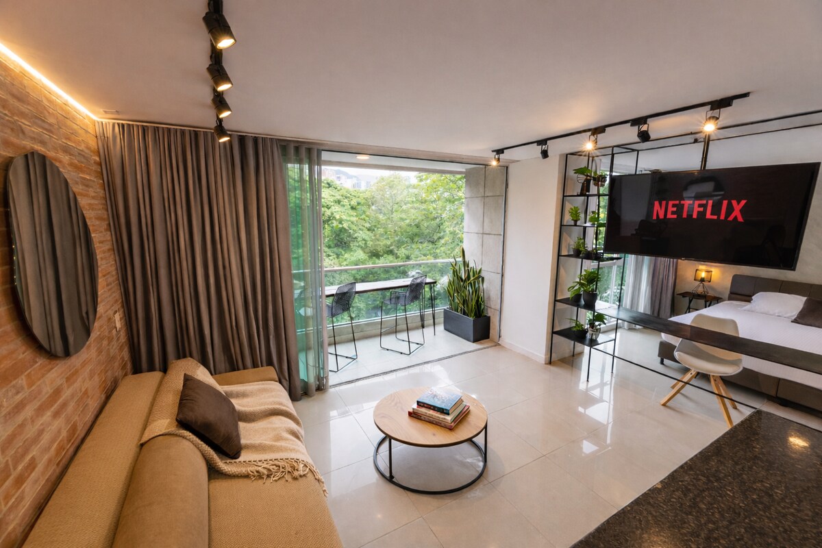 Welcome to our industrial loft in El Poblado, just steps from Provenza! Enjoy a modern space with high ceilings, panoramic windows, and a private balcony with garden views. It features a King-size bed, fast WiFi, a fully equipped kitchen, and a dedicated workspace. Just minutes from the best restaurants, cafés, and bars. Self check-in, 24/7 security, and free parking. Book now!🚀