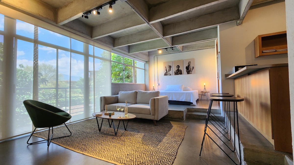 Welcome to our industrial loft in El Poblado, just steps from Provenza! Enjoy a modern space with high ceilings, panoramic windows, and a private balcony with garden views. It features a King-size bed, fast WiFi, a fully equipped kitchen, and a dedicated workspace. Just minutes from the best restaurants, cafés, and bars. Self check-in, 24/7 security, and free parking. Book now!🚀