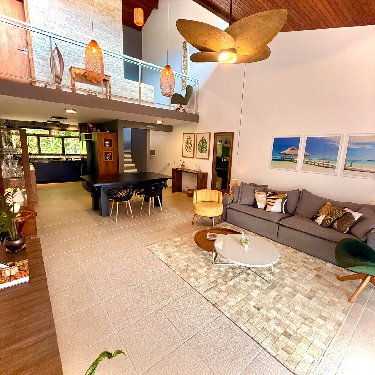 Casa em condomínio fechado, decoração charmosa moderna rústica, a apenas 7min da praia caminhando e 2 min dos principais restaurantes e SM. Rodeada pelo verde da Mata Atlântica, recém reformada, 3 vagas de garagem, 3 suítes de casal que acomodam confortavelmente até 6 pessoas e 3 crianças. A cozinha é para quem aprecia se entreter com familiares e amigos enquanto cozinha, pois é integrada com a sala bem ampla, churrasqueira e piscina privativa. Dias frios temos lareiras e dias chuvosos sala TV.