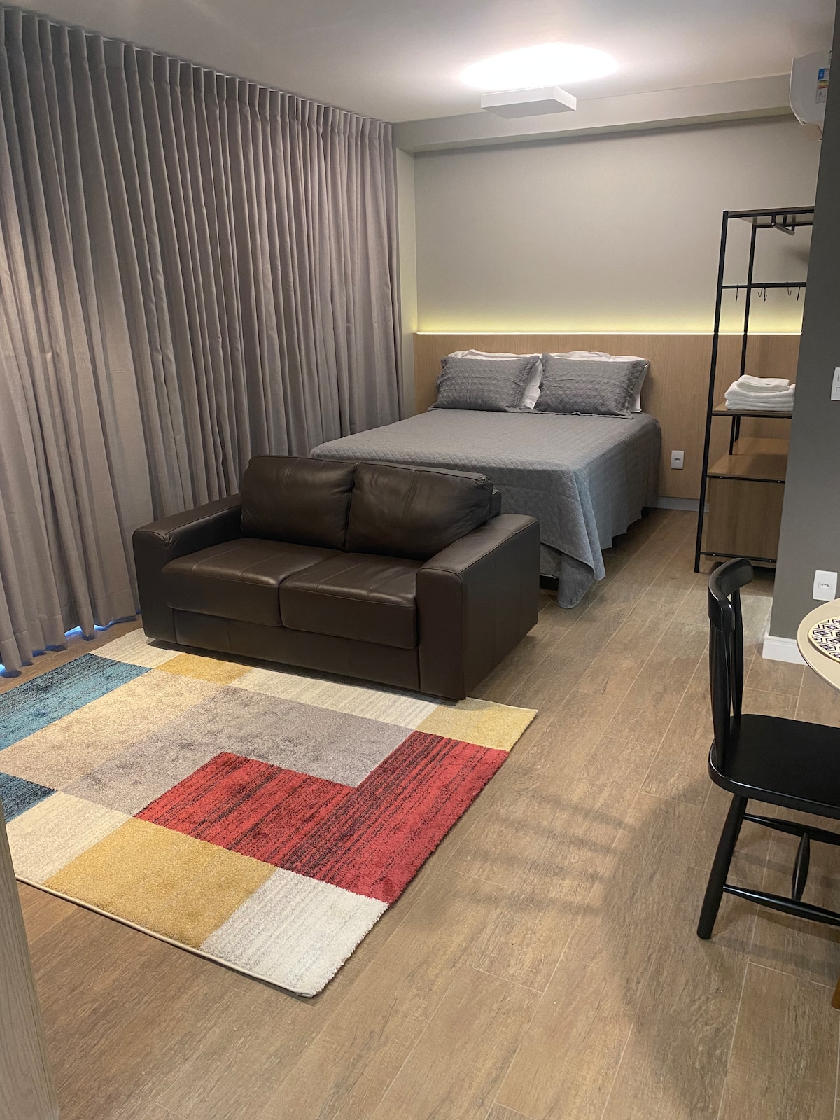 Studio apartment in an 18-story building, fully furnished, in the heart of Piracicaba, with 1 covered parking space, piped gas, water filter, appliances, intercom, 24-hour concierge, Wi-Fi, 50-inch Smart TV, electronic lock, security, and discretion. Close to markets, banks, bakeries, restaurants, churches, and shopping. Accommodates two guests with a double bed and an extra single mattress for a child. Small pets are welcome.