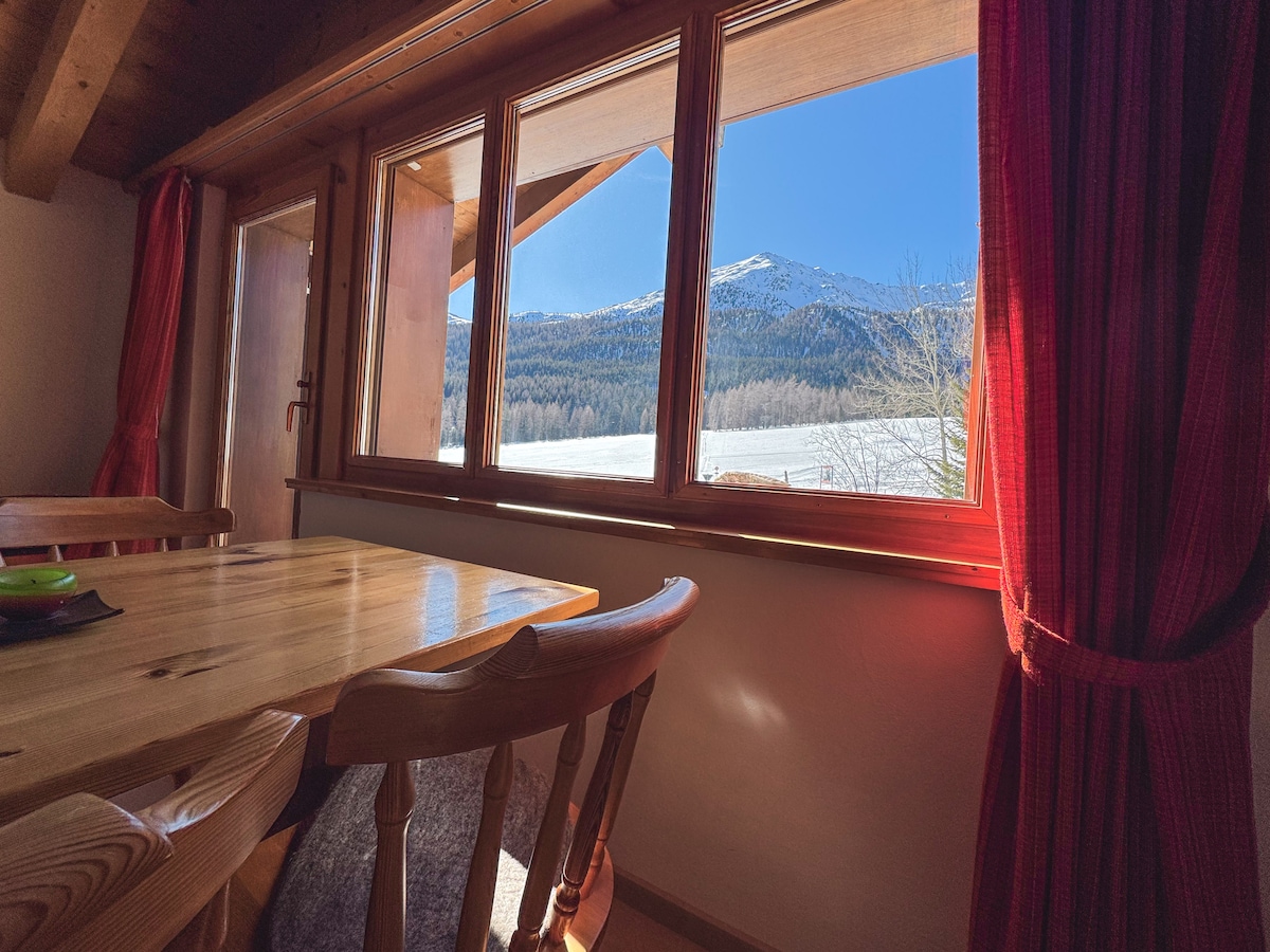 Eine entspannte und gemütliche Wohnung im 2. Stock eines Mehrfamilienhauses mit Balkon und Blick auf den Piz Daint im Val Müstair im Engadin. Die Talstraße führt am Haus vorbei - die Haltestelle des Postbus ist vor der Tür. Die Wohnung ist gut geeignet für Einzelpersonen oder Paare und auch für Familien ideal. Kinder lieben die außergewöhnlichen Schlafstellen. Es gibt Bücher und Musik und es darf alles mitbenutzt werden, die Küche ist voll ausgestattet.