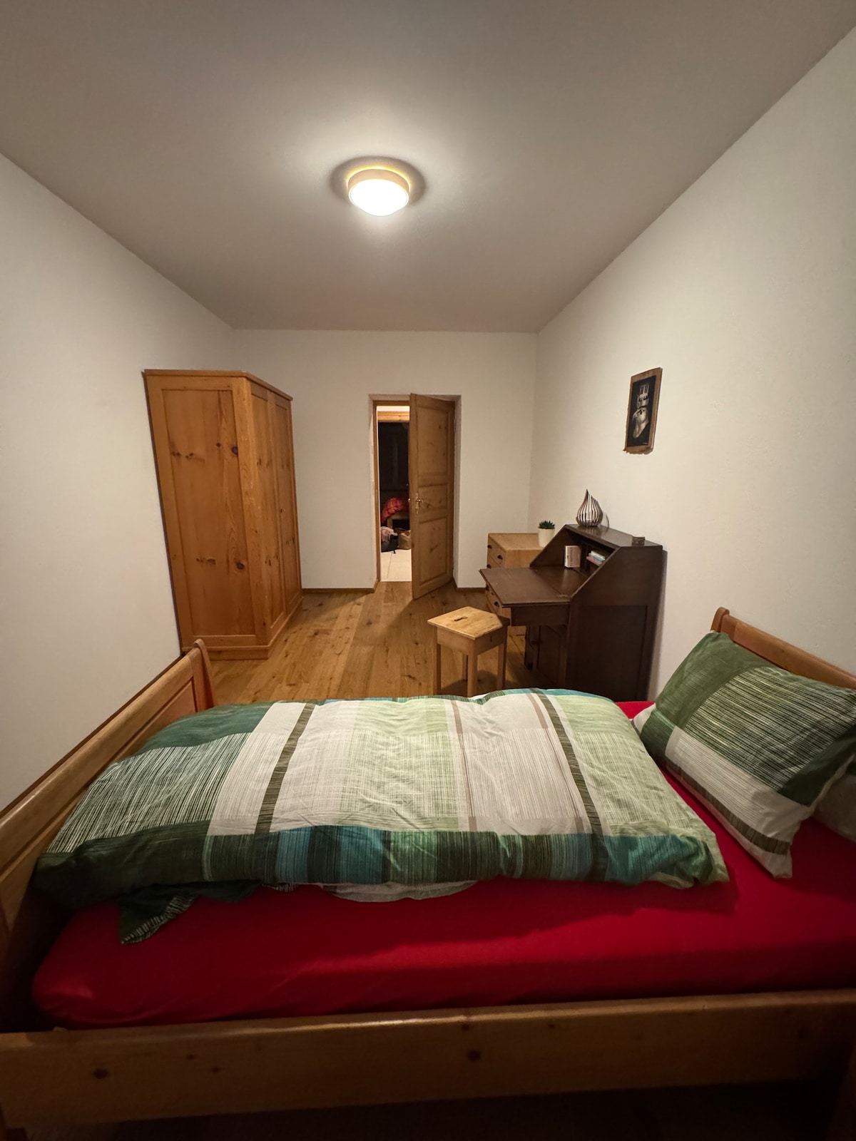 Quiet and sunny holiday flat in the heart of upper Engadin, 20 min car or train drive to St.Moritz. The flat offers a spacious living area and a fully equipped kitchen with a separate sleeping room. Totally there are three options for sleeping, a double bed (160x200), a daybed that can be extended for two kids or teens (2x80x200) and a bed sofa in the living room (140x200). However the flat is ideal for two adults and 1-2 kids. The flat has been renovated in 2024 and got fully refurbished.