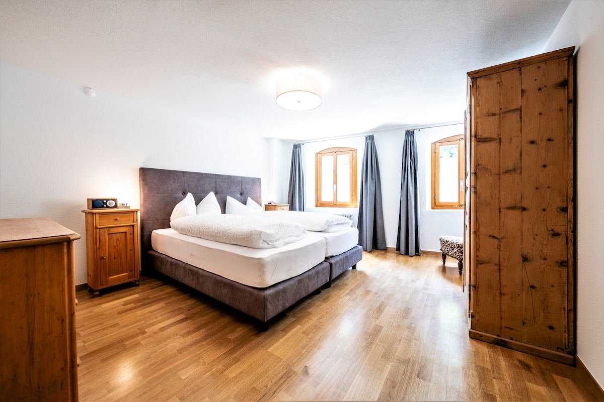 Dieses geräumige Appartement befindet sich im 3. Stock, verfügt über viel Münstertaler Arvenholz, ein Wohnzimmer mit einer offenen Küche und eine grosse Panoramafensterfront. Zwei Schlafzimmer mit Doppel-Boxspringbetten, ein modernes Bad und eine gedeckte Sonnenterrasse mit schöner Aussicht. Wie alle unsere Appartements ist auch dieses ein Unikat und ist mit ausgesuchten historischen Elementen ausgestattet.