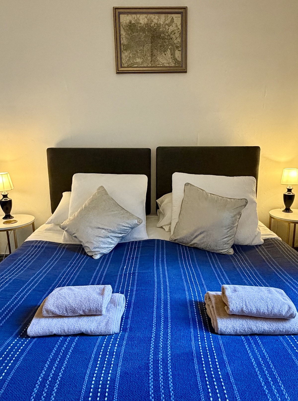 Paddington is one of the largest bedrooms within the complex and comes complete with an adjoining twin bedroom (with full size twin beds). Located on the first floor and boasting a stunning Superking bed with a magnificent bespoke, walnut headboard that was locally sourced from Norfolk Reclaim. Off the beautiful bedroom, you will find the shower en suite, decorated with an elegant blue hexagonal tile and a vibrant blue sink too! This bedroom is perfect for couples, friends or small families!!
