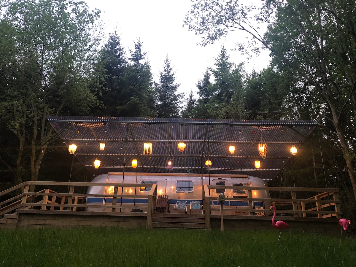 Quirky, peaceful and secluded - just you, nature, and your favourite tunes at the tiki bar. This 1978 Airstream is fully re-built by your hosts in a private 1/2 acre glade with a stream running through, wood-fired hot tub, outdoor chill zones: tiki bar, fire pit with hammocks and covered deck. All exclusive use. This one-of-a-kind Airstream conversion is bright, quirky & cozy with wood stove, king bed, sofa bed, plumbed wetroom, full kitchen + even doorbell! Retro made perfect.
