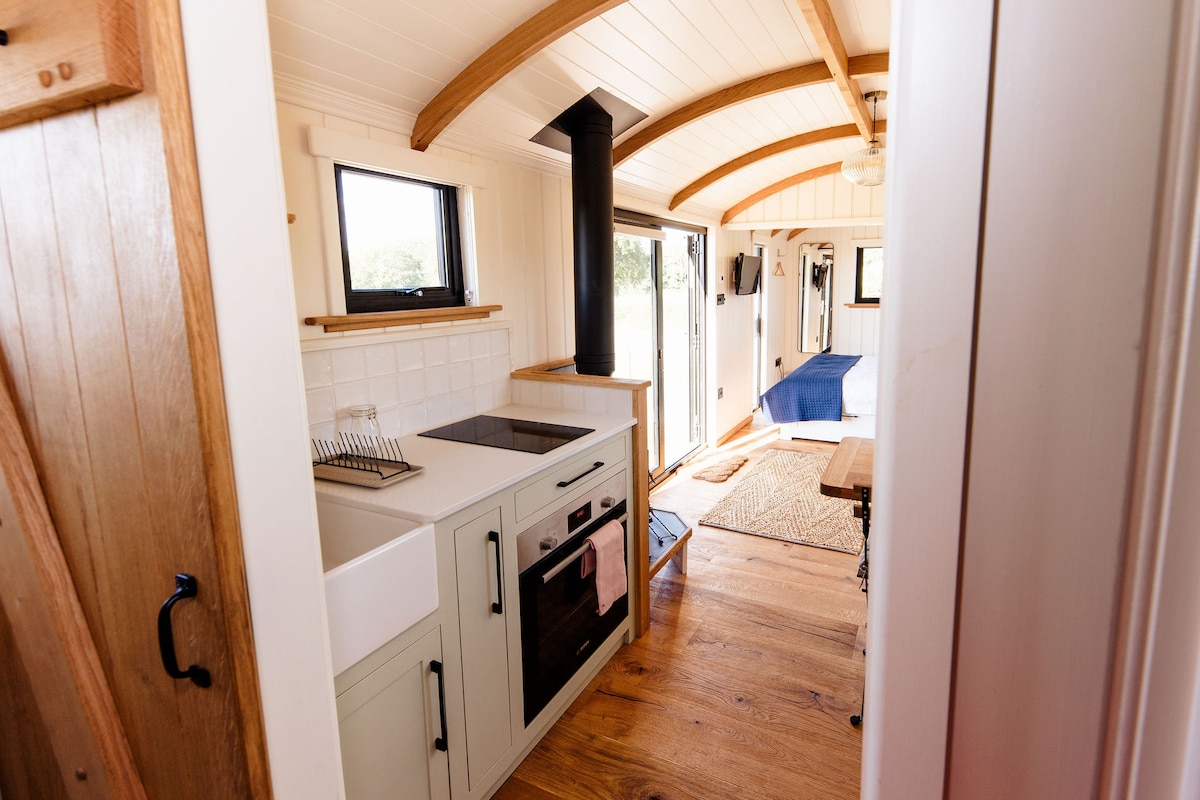 Luxury shepherds hut, en-suite shower room & wood burner, set in an orchard. We run a licensed riding school, Red Park Equestrian Centre, & have many friendly horses & ponies. A fully self contained unit, well equipped - full size fridge, icebox, two ring hob, smart tv, wifi & a cosy bed. There is outdoor space with picnic bench & a wood fired pizza oven. Be aware there can be noise from a playground. You are within walking distance of the village with wonderful pubs, eateries & takeaways.