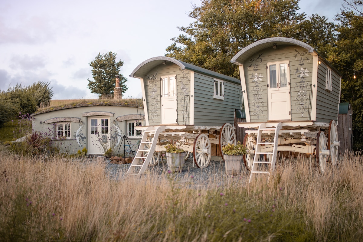 Tinker is not shepherd huts! It's a Unique home, with all amenities. Two big showman’s wagons and an underground bothy. The wagons, one a lovely bedroom with a super king bed, the other a gorgeous bathroom with shower and roll top bath, accessed by a tunnel, no going outside! The bothy is living area and kitchen. You will enjoy a private hot tub, and a wild flower meadow garden with furniture and a cooking fire pit. Set on a quiet private estate, this awesome retreat is a place to de-stress.