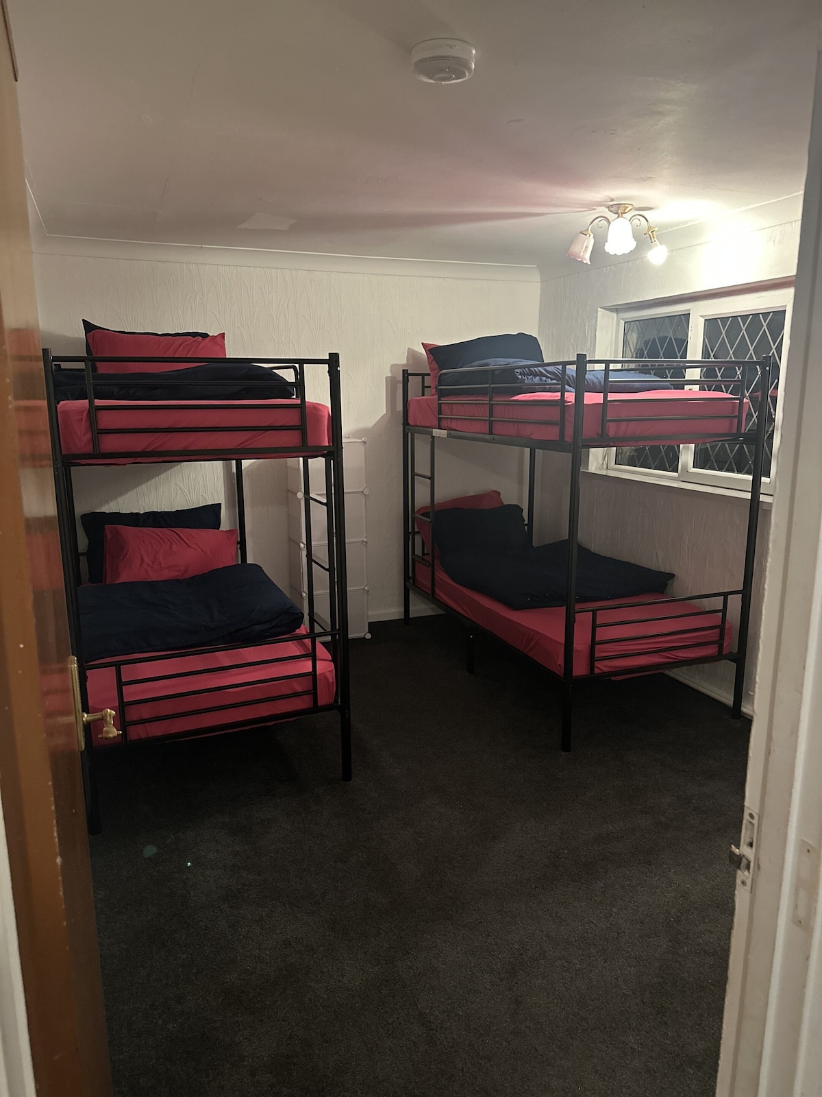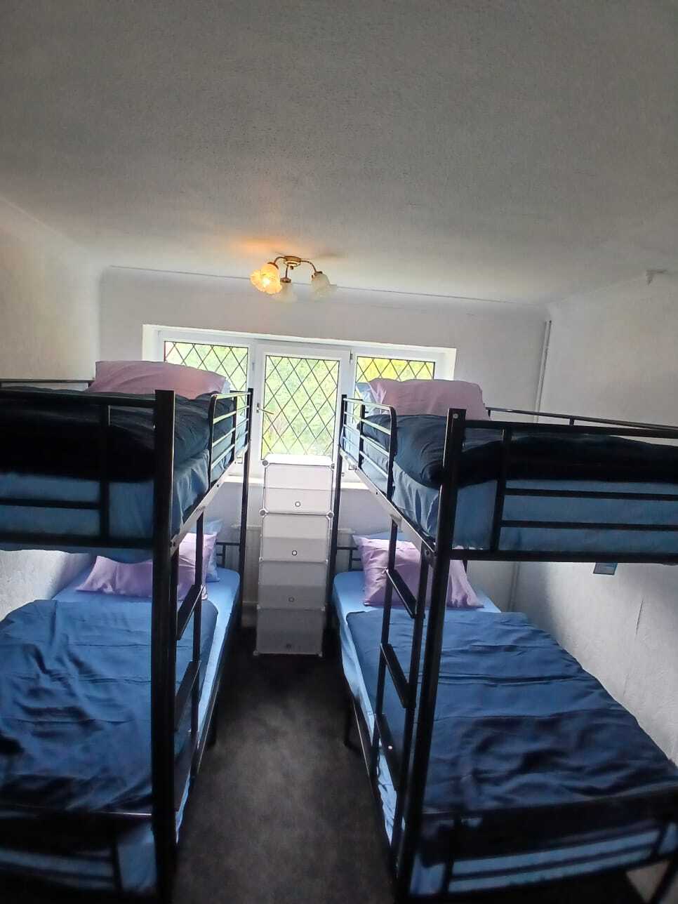 Compact bunk room with two beds and it's own shower and sink located on the ground floor of a small family run bunkhouse on Portland, Dorset. Bed linen and towels included. Communal kitchen, dining room and toilets available upstairs.