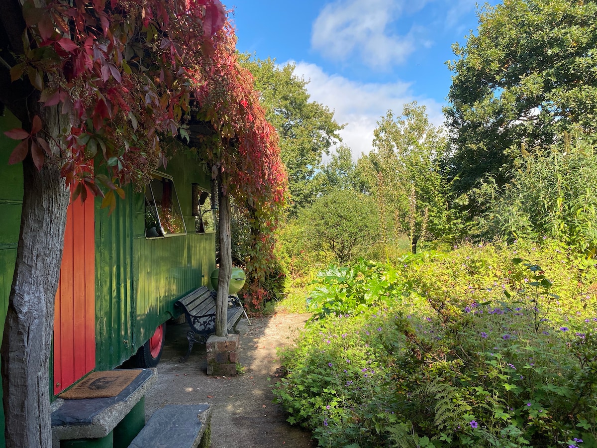 Tucked away in a beautiful private garden within idyllic 3-acre grounds, our romantic hideaway combines vintage charm with all mod cons - from underfloor heating to Nespresso-style coffee machine & fibre broadband! * Kingsize bed * Compact yet well equipped kitchen * Large private bathroom adjacent * BBQ & firepit (free wood) * Sauna, natural swimming pond (rainfall dependent), kayaks, games room, hammock * Hill walks on the doorstep, stunning beaches & cliff walks nearby * 1 dog welcome.