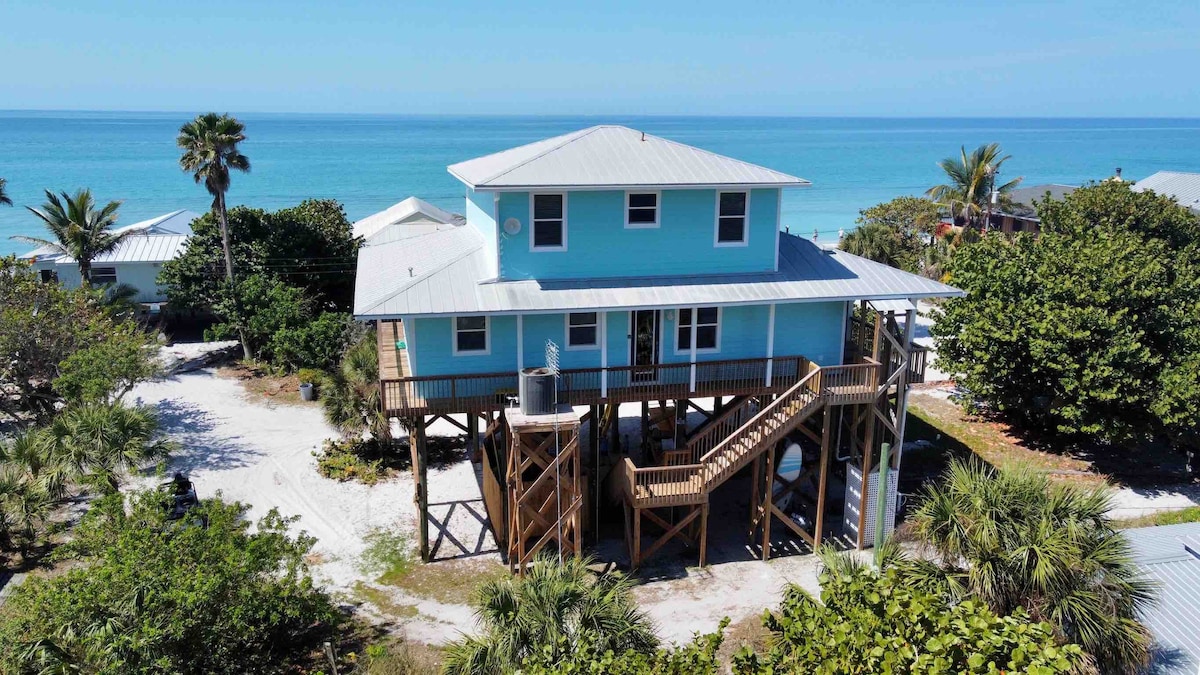 Experience true beachfront luxury at this elevated Gulf-front home on Manasota Key, where breathtaking views, open space, and direct beach access create the ultimate coastal escape. Just steps from the sand, this retreat delivers panoramic Gulf views from the living room, primary suite, and oversized wraparound porch — making every moment feel like front-row seating to paradise.