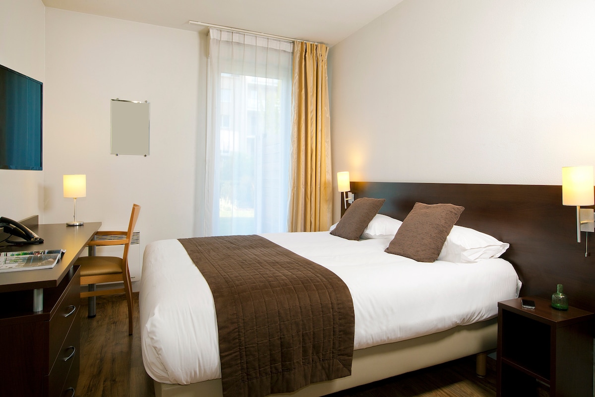 Appart 'hôtel équipé pour 4 personnes, avec une chambre lit king size, une cuisine aménagée (plaques induction, réfrigérateur avec freezer, micro ondes, cafetière, bouilloire) un coin repas, un salon avec un grand canapé lit pour 2 adultes, TV, une salle de bain avec baignoire, sèche cheveux, miroir grossissant, wc séparé, balcon ou terrasse équipés. Certains sont communicants avec une chambre (à réserver en sus). Animaux: se renseigner. Accès gratuit (30mn/jour) au spa, sauna sur réservation.