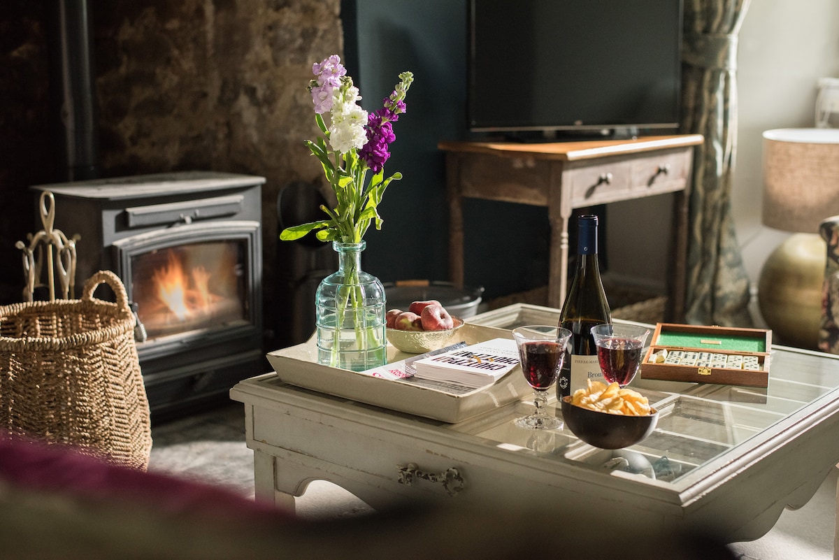时尚舒适的双卧室小屋,配备原木燃烧器