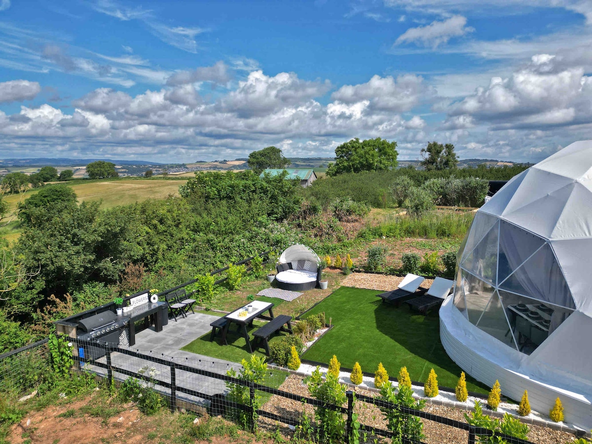 A private space with stunning views over the rolling hills of rural Devon with protected dark skies and a wood fired hot tub. A luxury 6m dome with a King Size 4 Poster bed, wood stove, private bathroom, decked terraces, kitchen area, fire pit and on-site alcohol sales, selling wine, beer and local cider. Situated next to the forest perfectly between the hills of Dartmoor and the coast of North Devon and Cornwall. Hot tub preheating available for £30 (water temperature of 32-38c is pleasant)