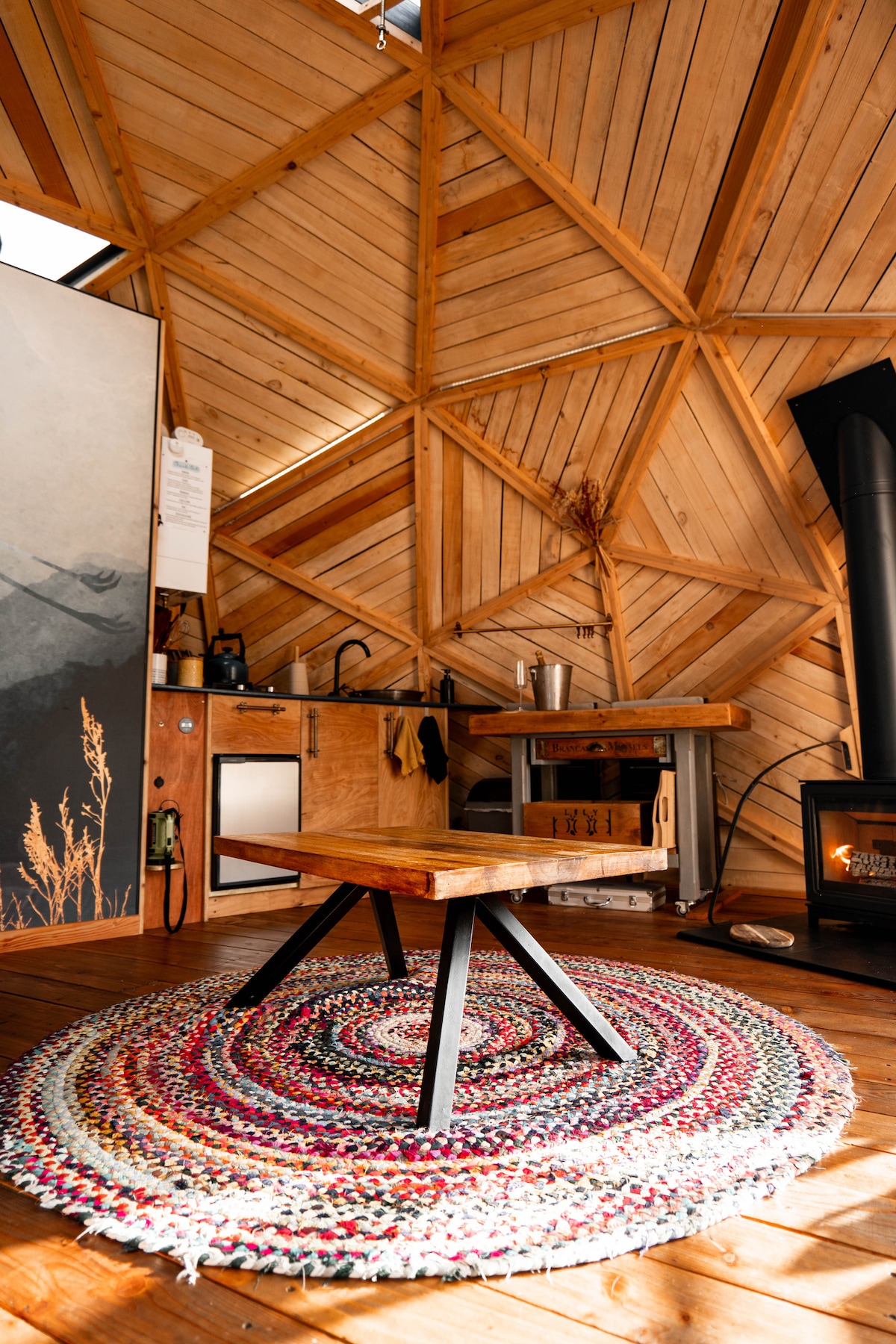 Sunset Ridge Geodesic Dome is situated in its own private, gated area and has some stunning views of the Cornish countryside. Fully insulated and with it's own wood-burner, our dome is very cosy all year round. Complete with separate shepherd's hut bathroom and kitchen area. Everything you need provided for a bit of luxury downtime. Spacious, comfortable and private. With a minimum 1 night stay, this is perfect for birthdays or a special anniversary. Early check-in sometimes possible.
