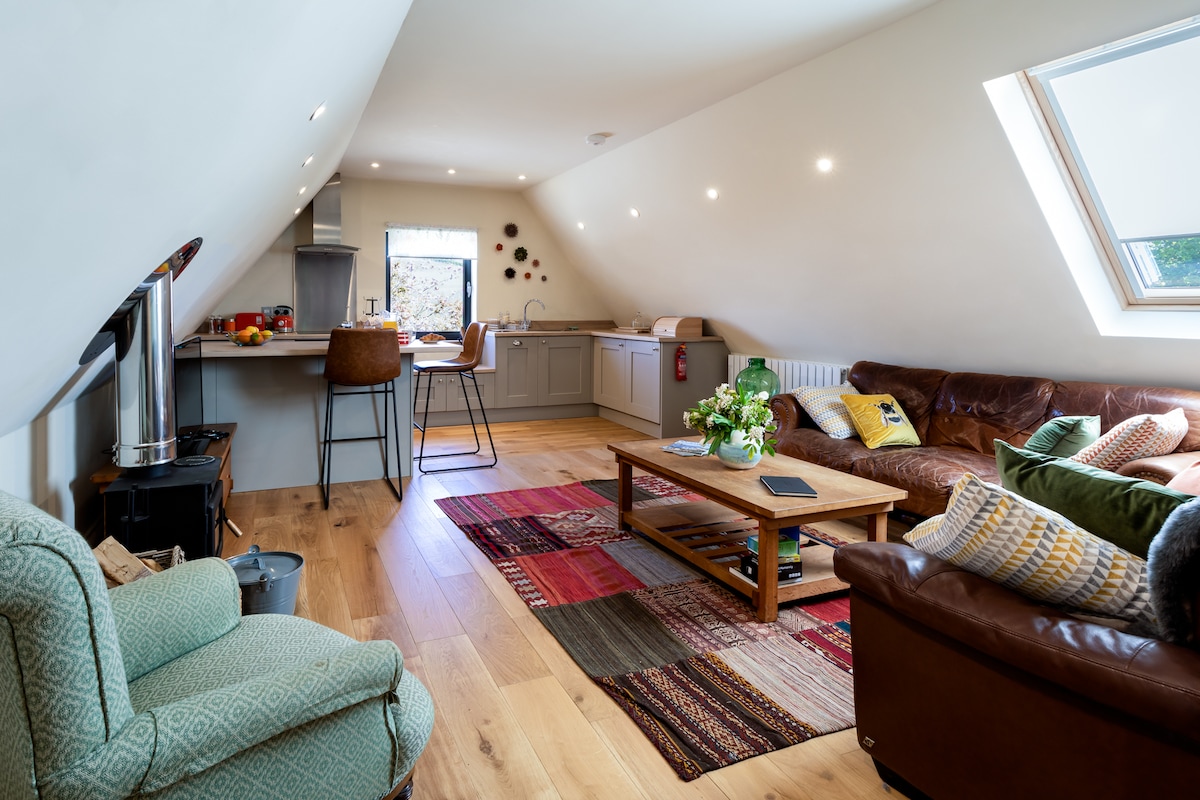 Enjoy a beautifully renovated loft conversion with private access in the heart of historic Totnes just 7 minutes walk from the railway station Visit this culturally vibrant town with its Norman castle, traditional weekly markets, climate hub, independent cinema and many independent cafes restaurants shops & pubs: www.airbnb.com/slink/u7YFDN4Y Enjoy stunning walks along the river Dart from our front door or visit beautiful beaches or Dartmoor nearby Ideal for couples, young families, friends