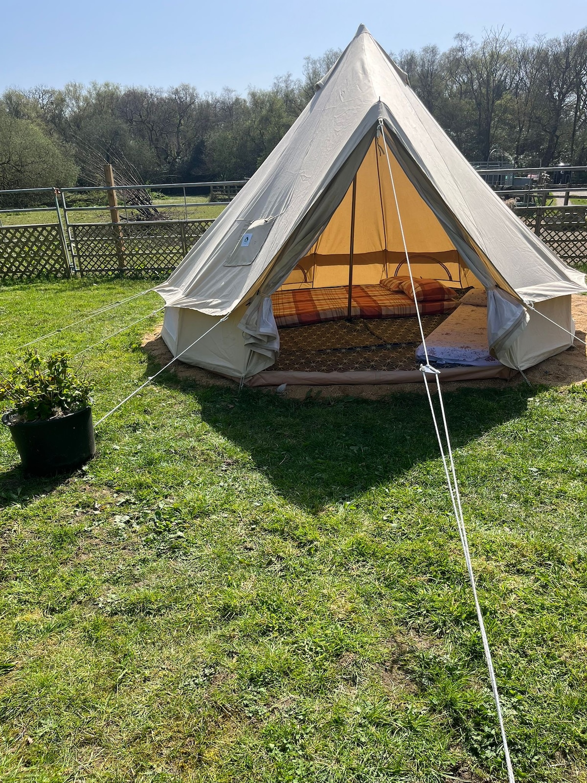 Poppy tent has a proper double bed Mini fridge Electric lights and fairy lights inside it. Single futon Electric charging points Rugs Tea lights Tea coffee sugar Double burner gas stove little pots and pans and stove top kettle. Lovely roll top bath shower attached sink and a composting loo (cleaned when needed) Outside pizza oven Picnic bench Bbq Fire pit Wood charcoal matches provided 🌼🌼Hot tub charged at £30 per stay🌼🌼 paid via air bnb extra services