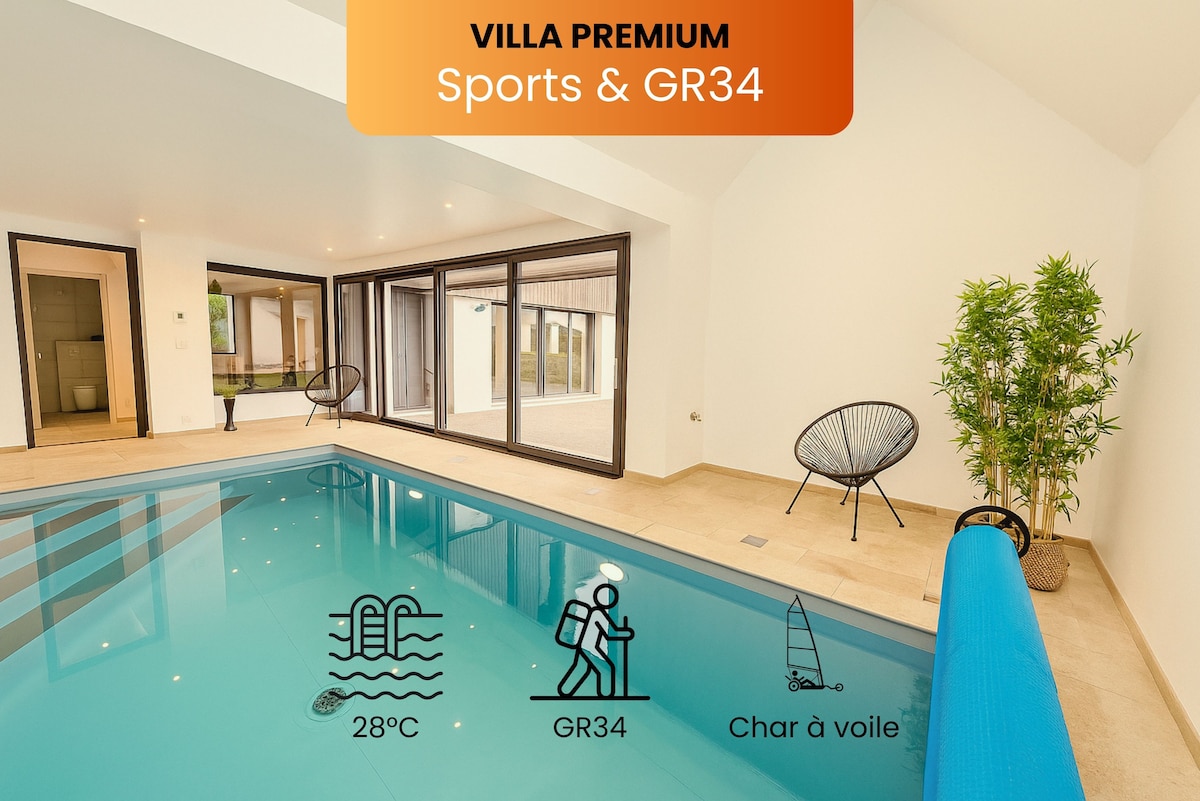 Villa 300 M² privative sans vis à vis. RDC : piscine intérieure chauffée à l'année (29°/9x4 mètres, chaises longues, jeux eau), cuisine américaine entièrement équipée, 2 chambres, salle de douche + douche à l'italienne, wc séparé, buanderie. 1er étage : salon (TV connectée), espace sport/coin nuit (tapis course, rameur, vélo, canapé lit tout confort). Extérieur : terrasse 120 M² sans vis à vis (mobilier jardin, barbecue gaz, table ping pong) + jardin (terrain pétanque, trampoline, balançoire).