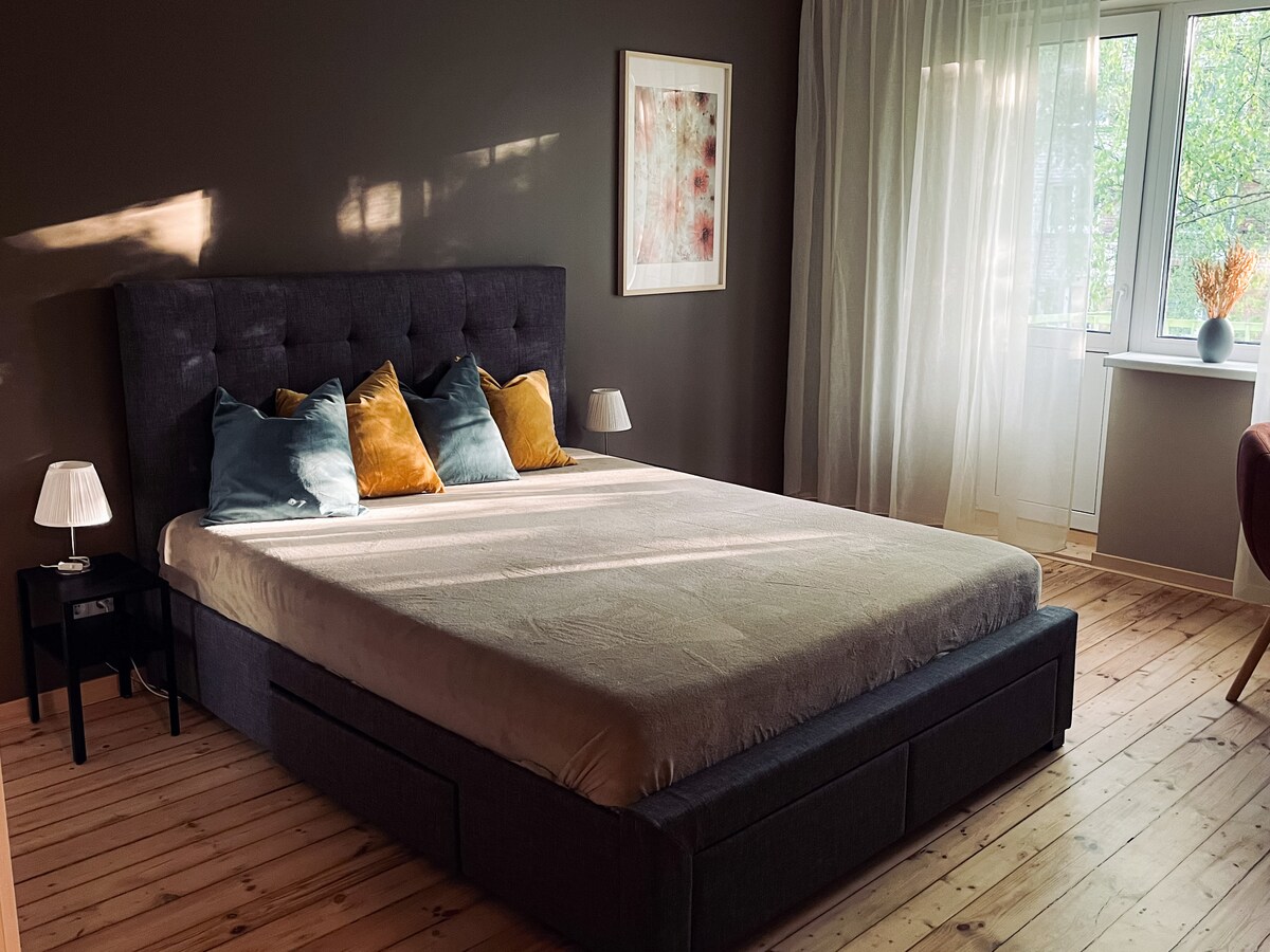 Lovely apartment on the west bank of the Daugava river – ideally located between the Riga international airport and the city center in an old wooden house just opposite the Botanical garden. The space is decorated with a vintage taste and has all the comfort needed for you to feel at home. With 50 sqm, a small balcony on the back, a separate toilet, bathtub, kitchen, bedroom with a king size bed and living room with a sofa bed, it is a perfect place to stay for 2-4 people.